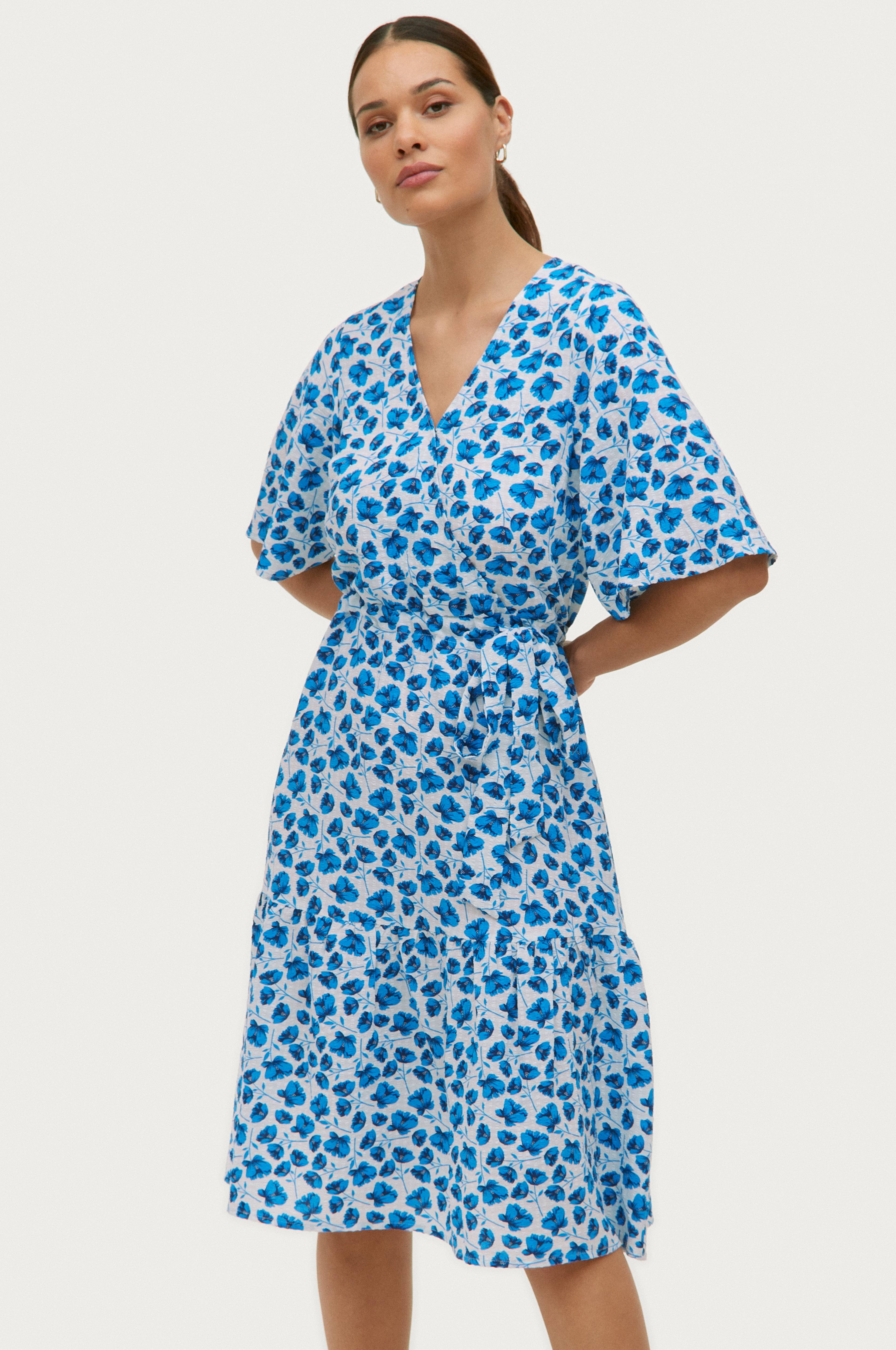 • V-udskæring med slå-om og skjult trykknap• Halvlange sommerfugleærmer• Træksnørre ved taljen med bindebånd i siden• Volant nederst• Længde: 114 cm i størrelse 34/36