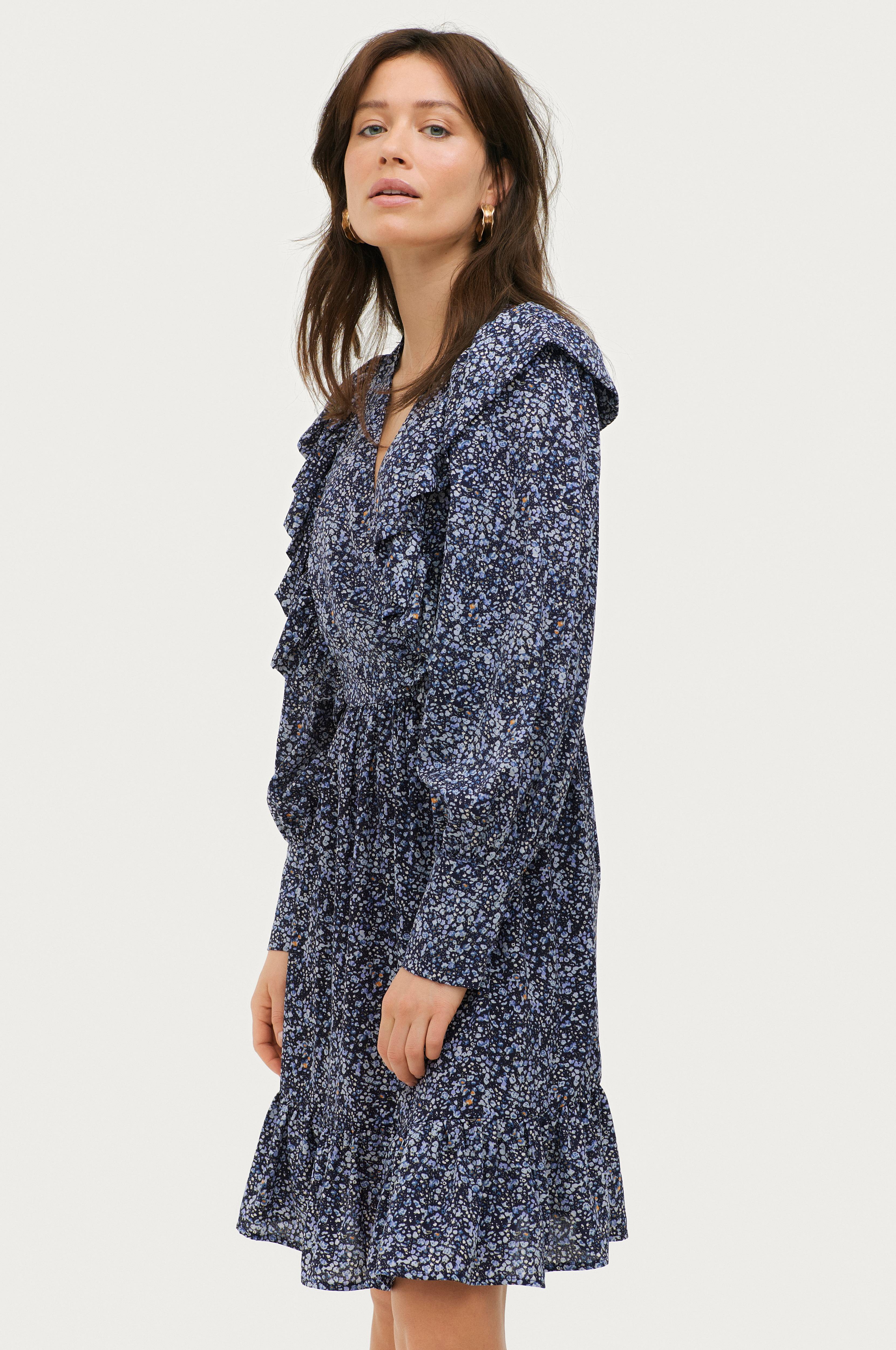 • V-hals med slå-om• Volant foran og i nakken• Ballonærmer med bred manchet• Elastik bagpå ved taljen• Volant nederst• Længde: 96 cm i størrelse 36