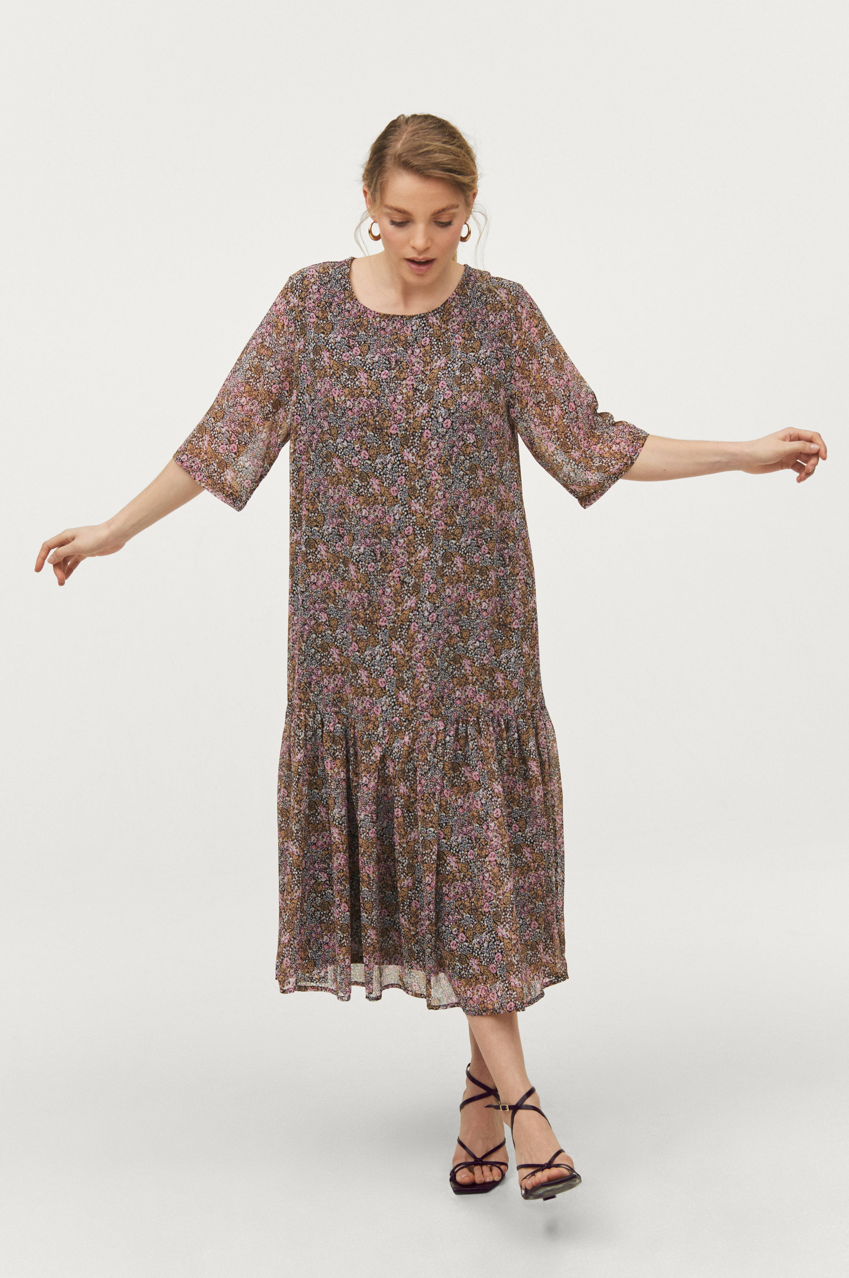 A-formet model i vævet chiffoncrepe med bred, påsyet flæse i kanten forneden. Rund hals med smal søm og slids med knap i nakken samt lige, halvlangt ærme. For i jersey. Længde ca. 117 cm i str. S.