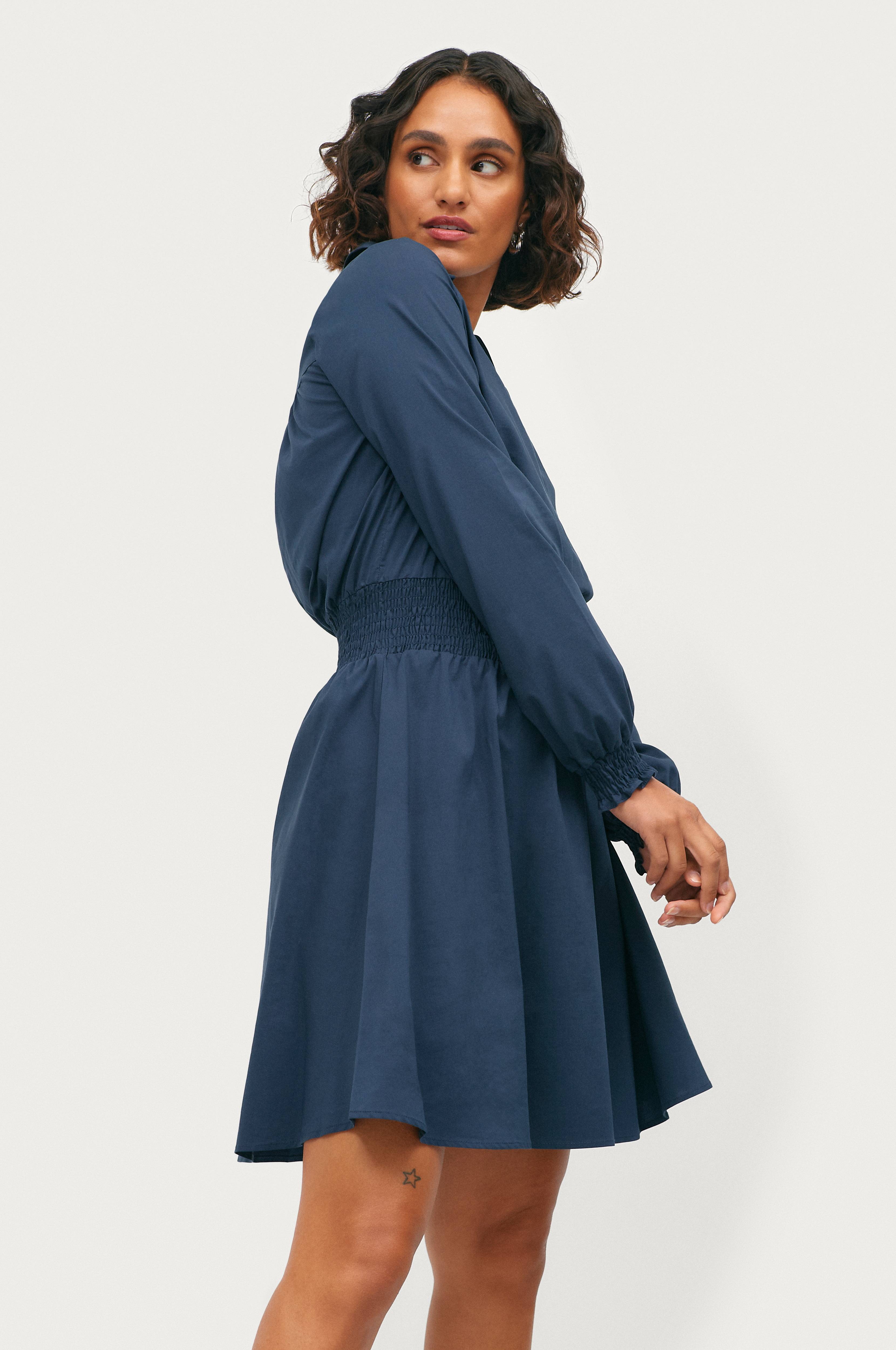 • V-udskæring med krave• Defineret talje med smock• Lange ærmer med smock ved manchetterne• Samling i ryggen• Længde: 93 cm i størrelse 34/36
