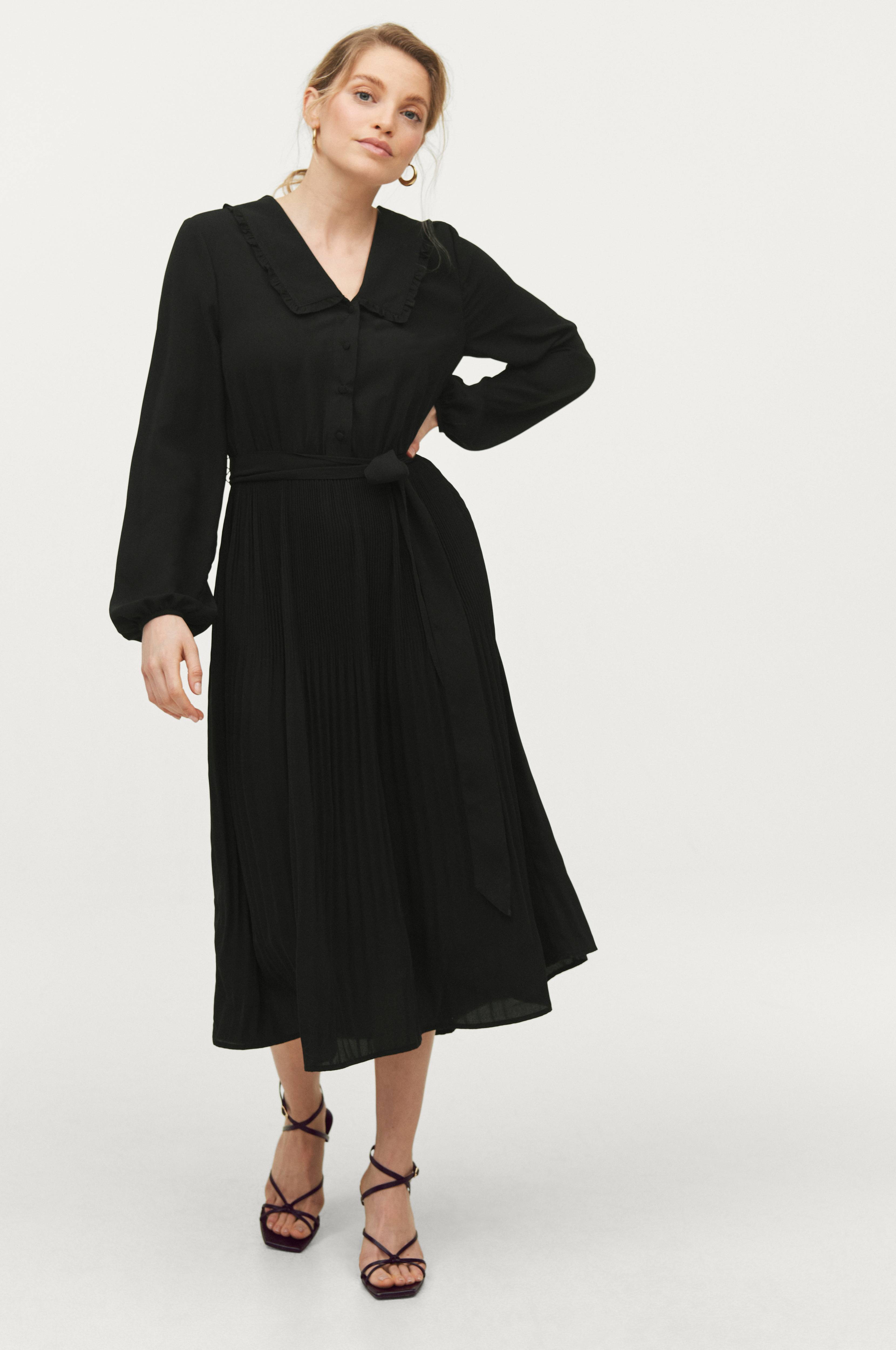 Kjole Josette i vævet kvalitet med plisseret nederdel og glat overdel. Betrukne knapper foroven foran og bred krave med ruchekant. Lange ærmer med smal ærmekant med beklædt knap. Bindebælte i taljen. Længde ca. 118 cm i str. 36.
