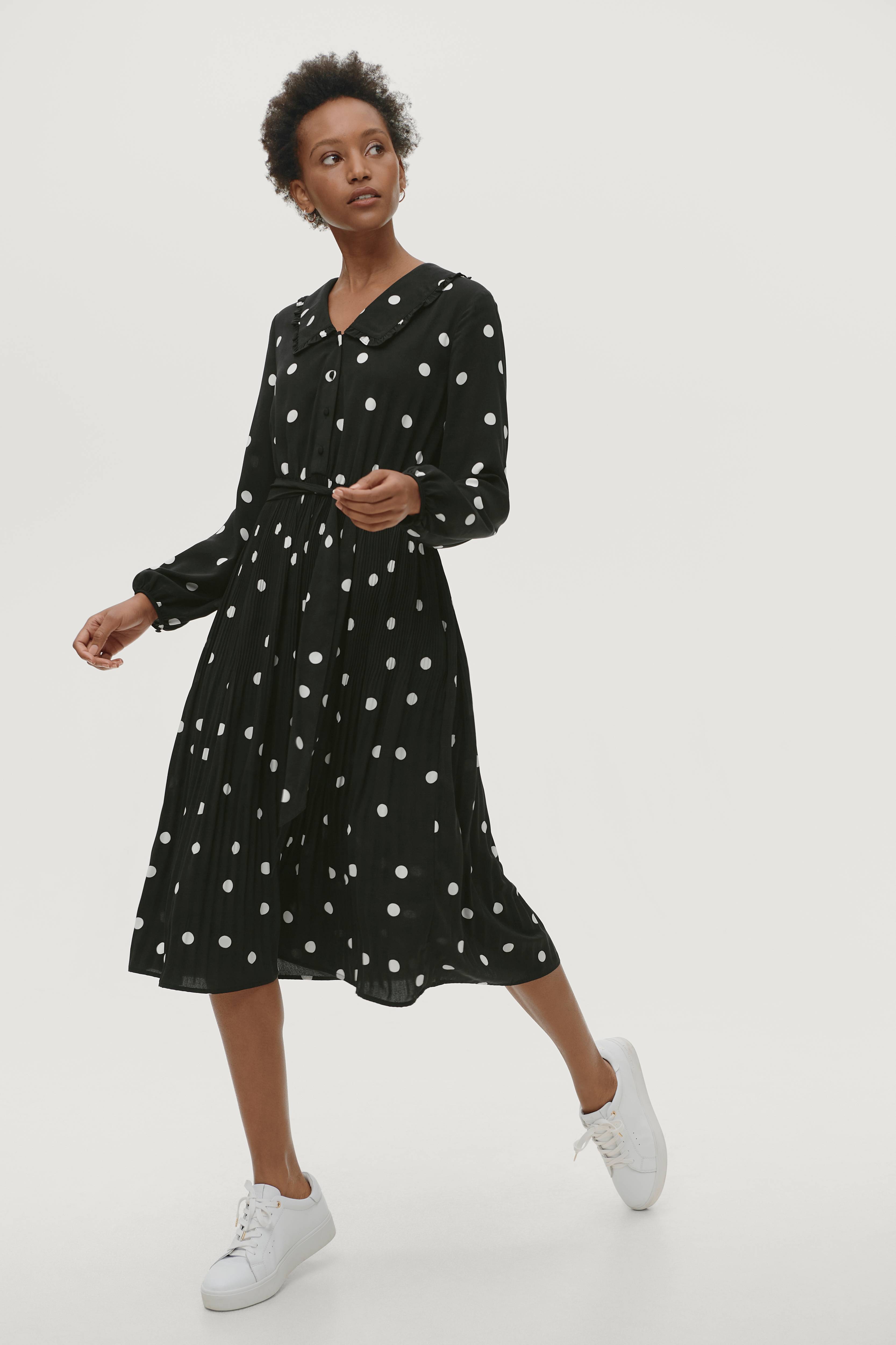 Kjole Josette i vævet kvalitet med plisseret nederdel og glat overdel. Betrukne knapper foroven foran og bred krave med ruchekant. Lange ærmer med smal ærmekant med beklædt knap. Bindebælte i taljen. Længde ca. 118 cm i str. 36.