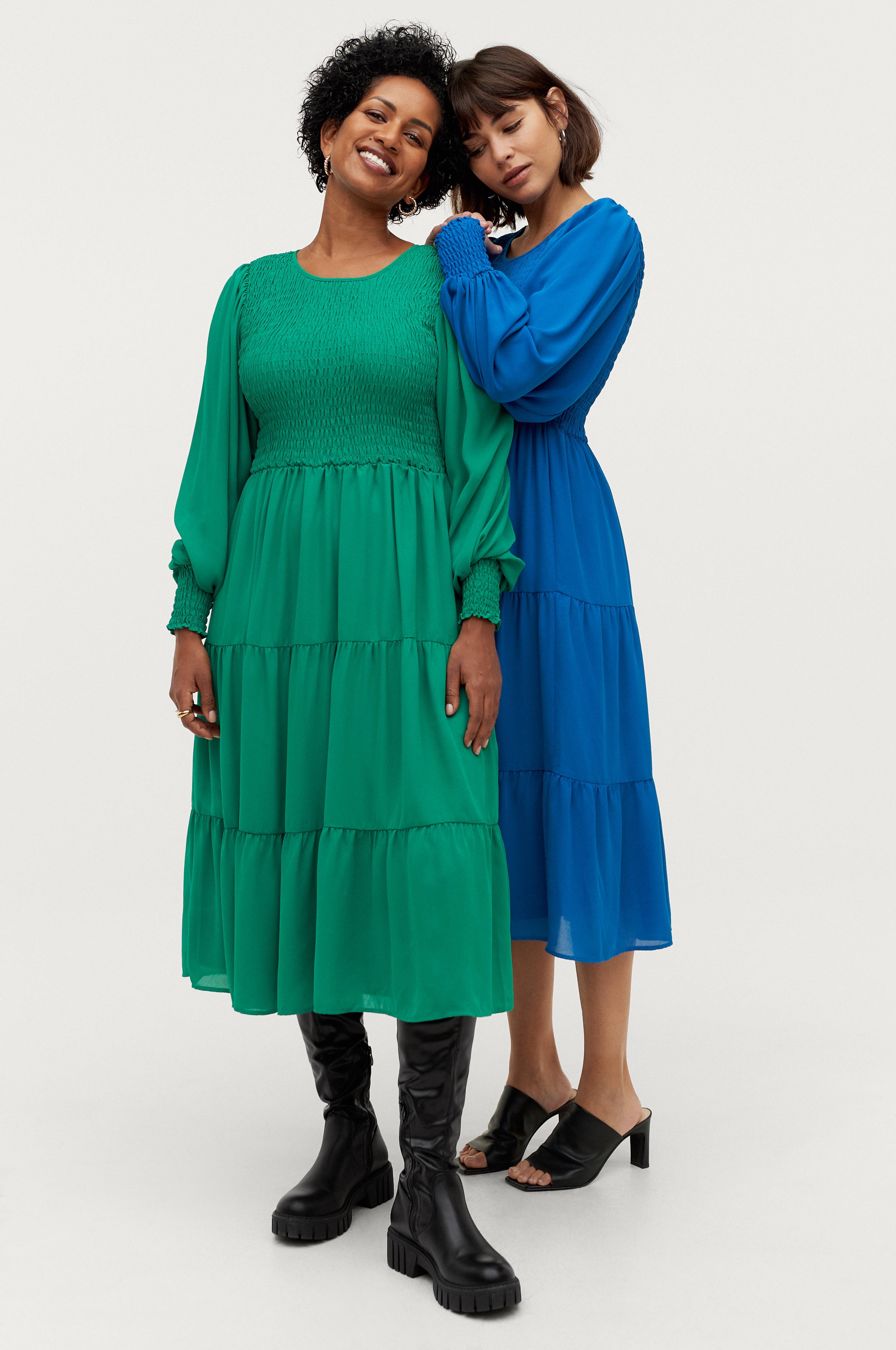 Har begge farver i størrelse 38/40. Sidder meget pænt på, den samme pasform på mig som på modellen i den blå kjole, undtagen min buste er større. Ville sige, det er rummelig i større…