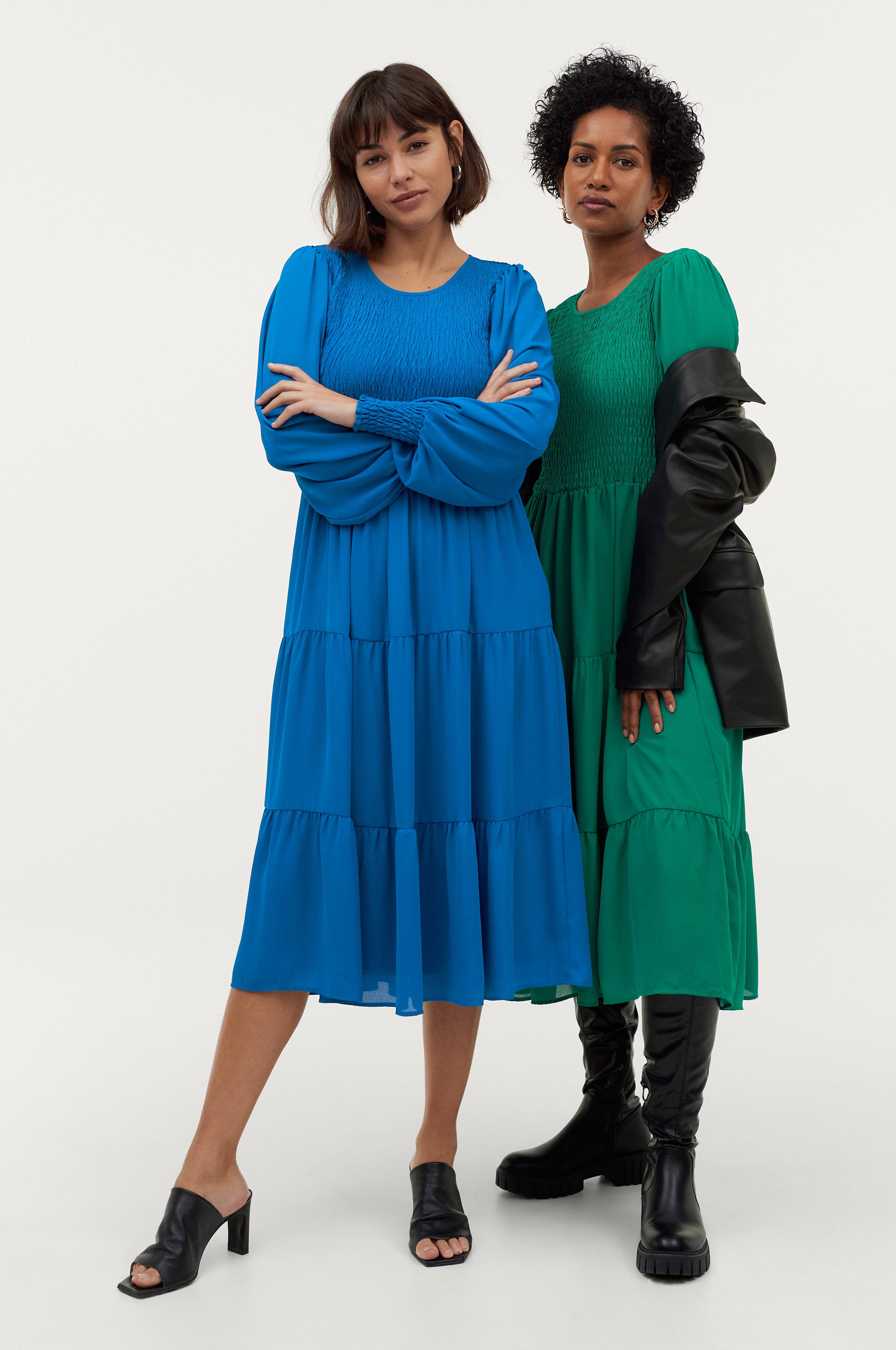 Læglang kjole med kropsnær overdel i elastisk smock. Rund hals med slids og knap i nakken. Lange ballonærmer med bred smock i ærmekanterne. Elastisk talje og A-formet nederdel med dekorativt rynkede sømme rundt om. Nederdelen er foret i jersey som giver et tungt fald. Længde ca. 116 cm i str. 34/36.