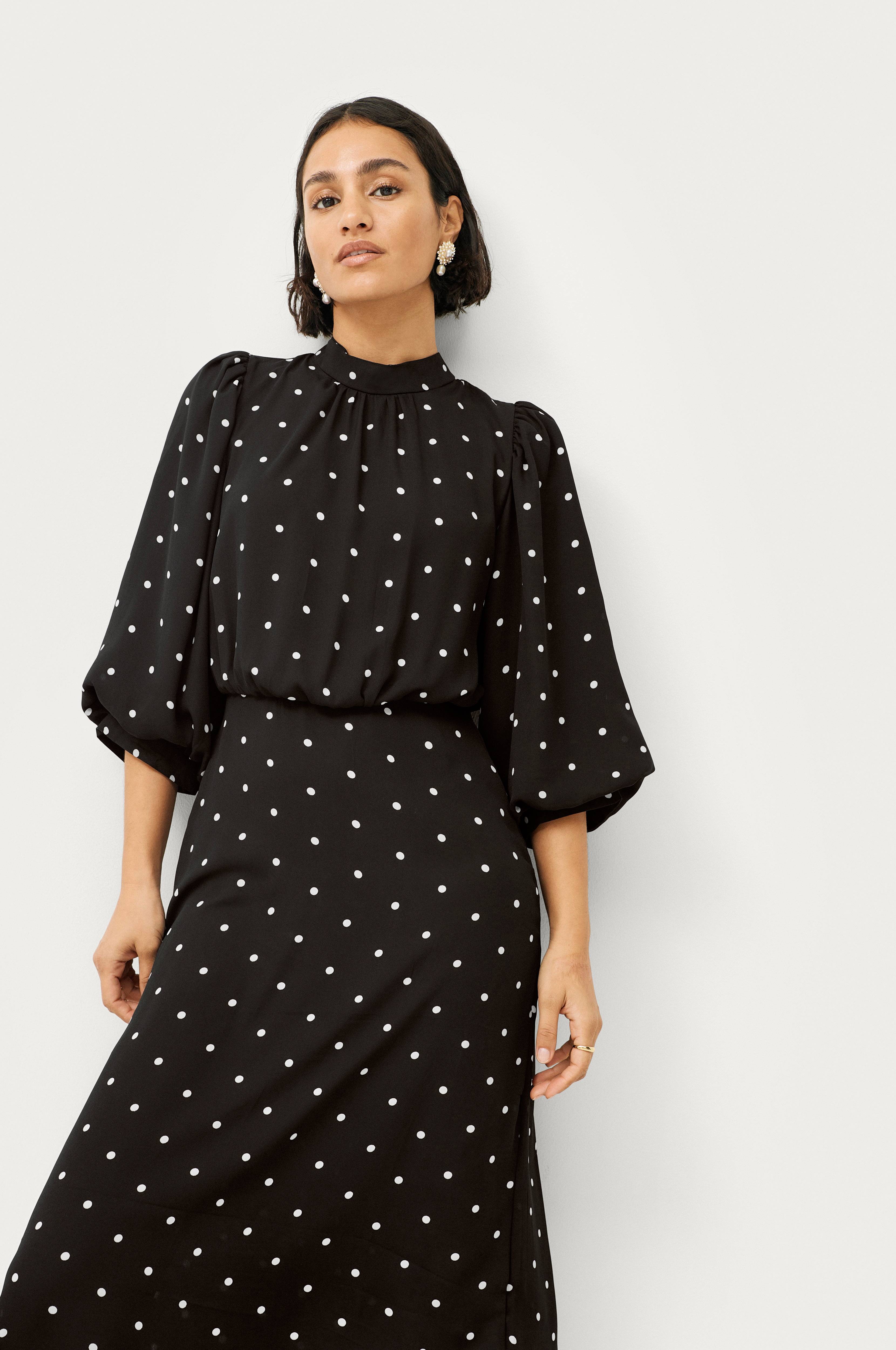 • Model med svaj • 3/4 lange ballonærmer • Ståkrave med samling foran • Ventilation med knap i nakken • Elastisk bånd bagpå ved taljen • Længde: 119 cm i størrelse 36 • Produktet indeholder genindvundet materiale, som genbruges for at reducere mængden af affald samtidigt med at der ikke anvendes nye ressourcer.