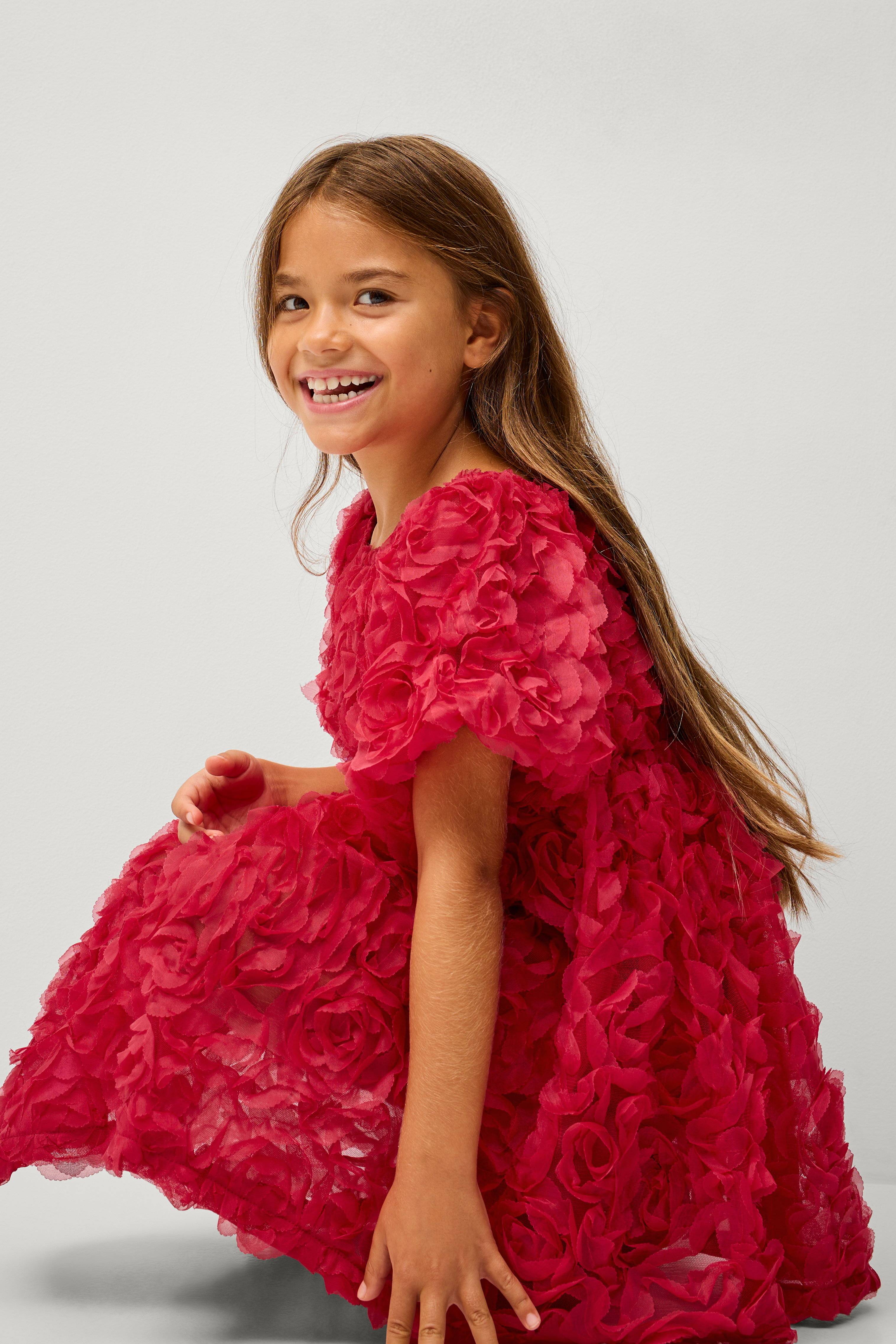 • Foret kjole i mesh med 3D-blomster • Rund, elastisk halsudskæring • Korte ballonærmer med elastik ved manchetterne • Elastik ved taljen • Elastisk for