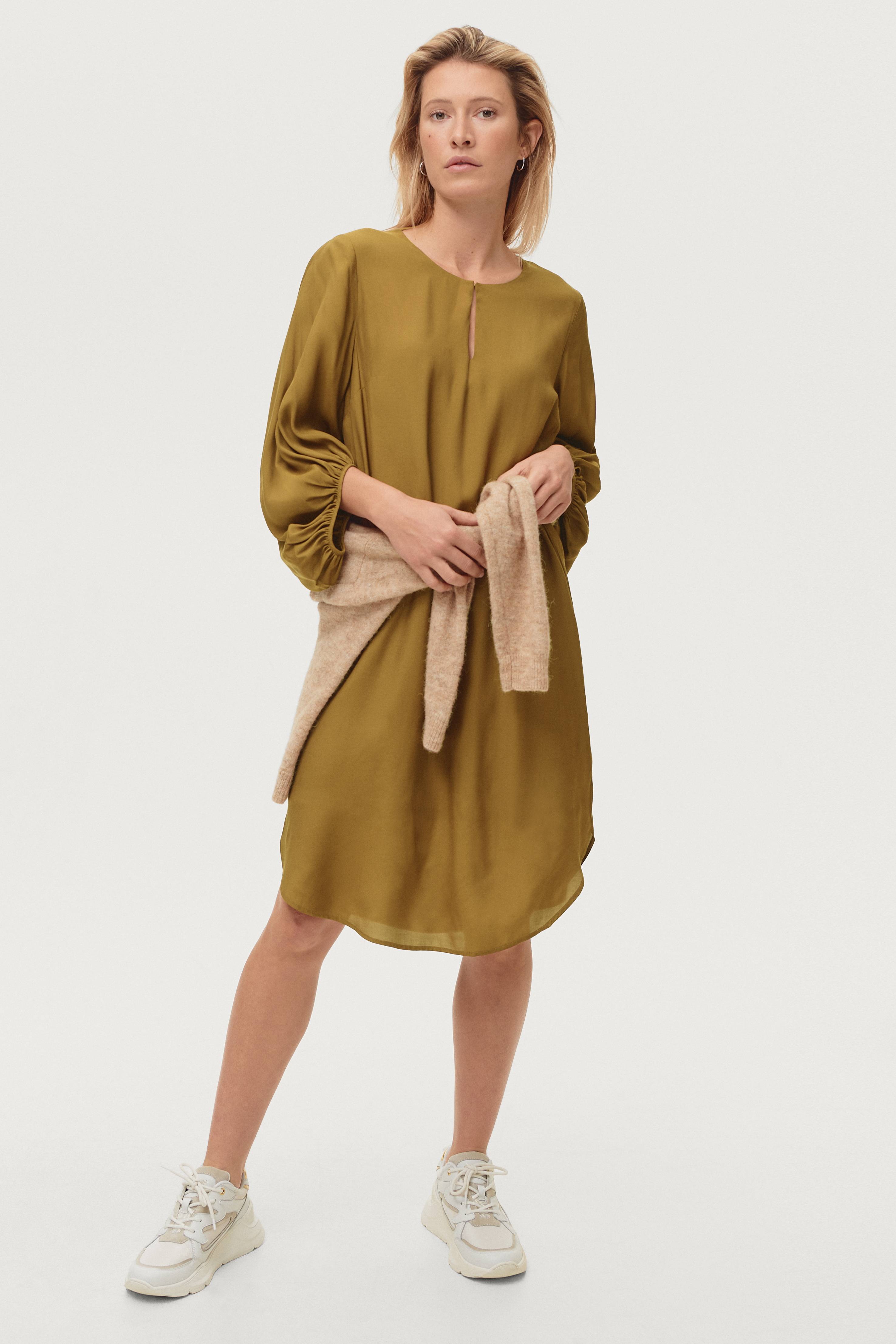 Kjole Lova i vævet viskose med fin glans. Lige, læglang model med slids og skjult hægte og malle i halsudskæringen foran. Lange ballonærmer med asymmetrisk ærmekant som giver fin form. Afrundet kant forneden. Længde ca. 107 cm i str. 36.