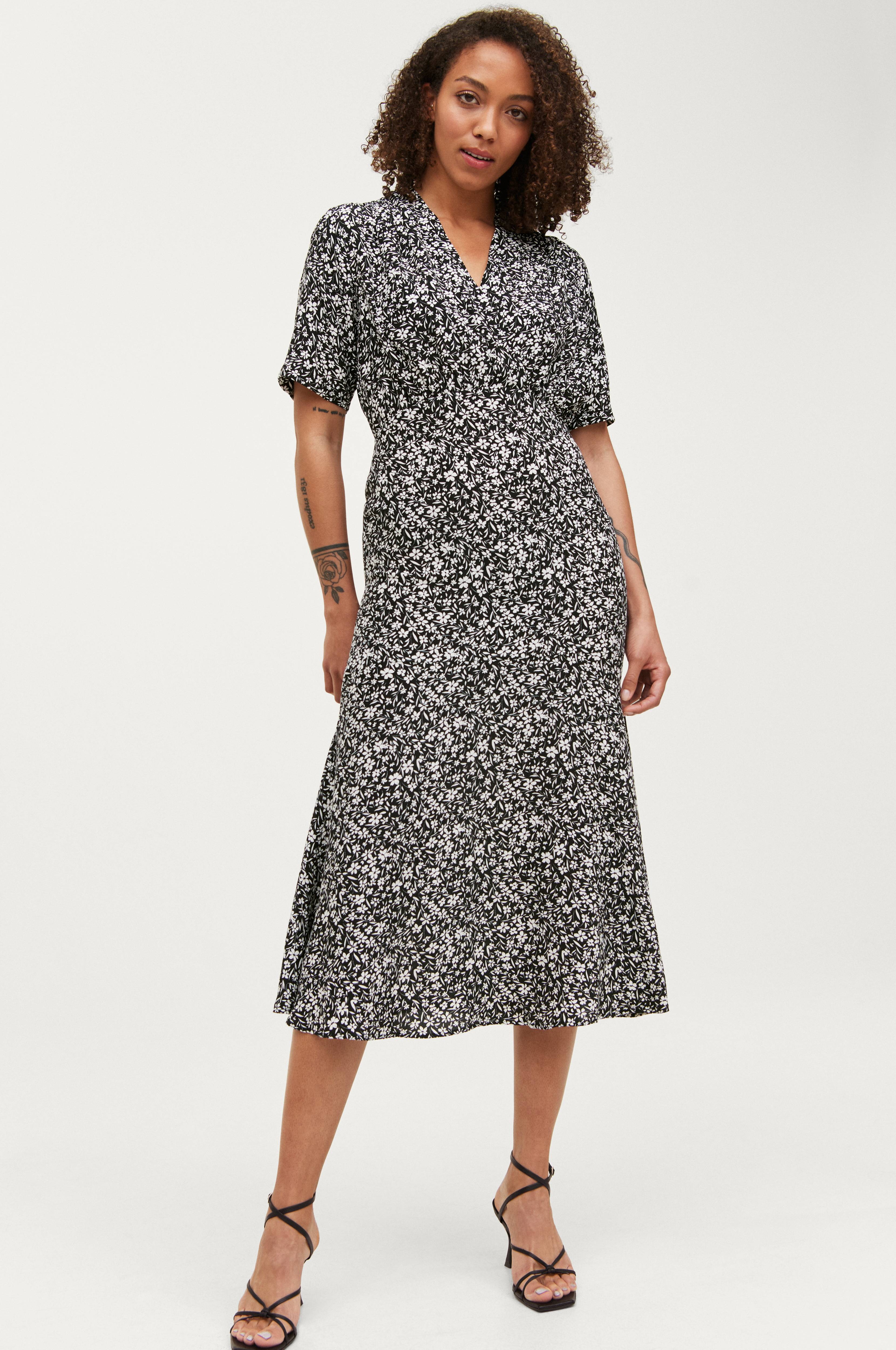 Kjole Luiza i figursyet model med slå om-snit foroven. Afrundet afskæring med rynkning foran og lige afskæring bagpå i taljen. Rynkning foran på skuldrene og kort ærme samt flot, vid indsats forneden på nederdelen. Vævet crepekvalitet med printet mønster og blødt fald. Længde ca. 127 cm i str. 36.
