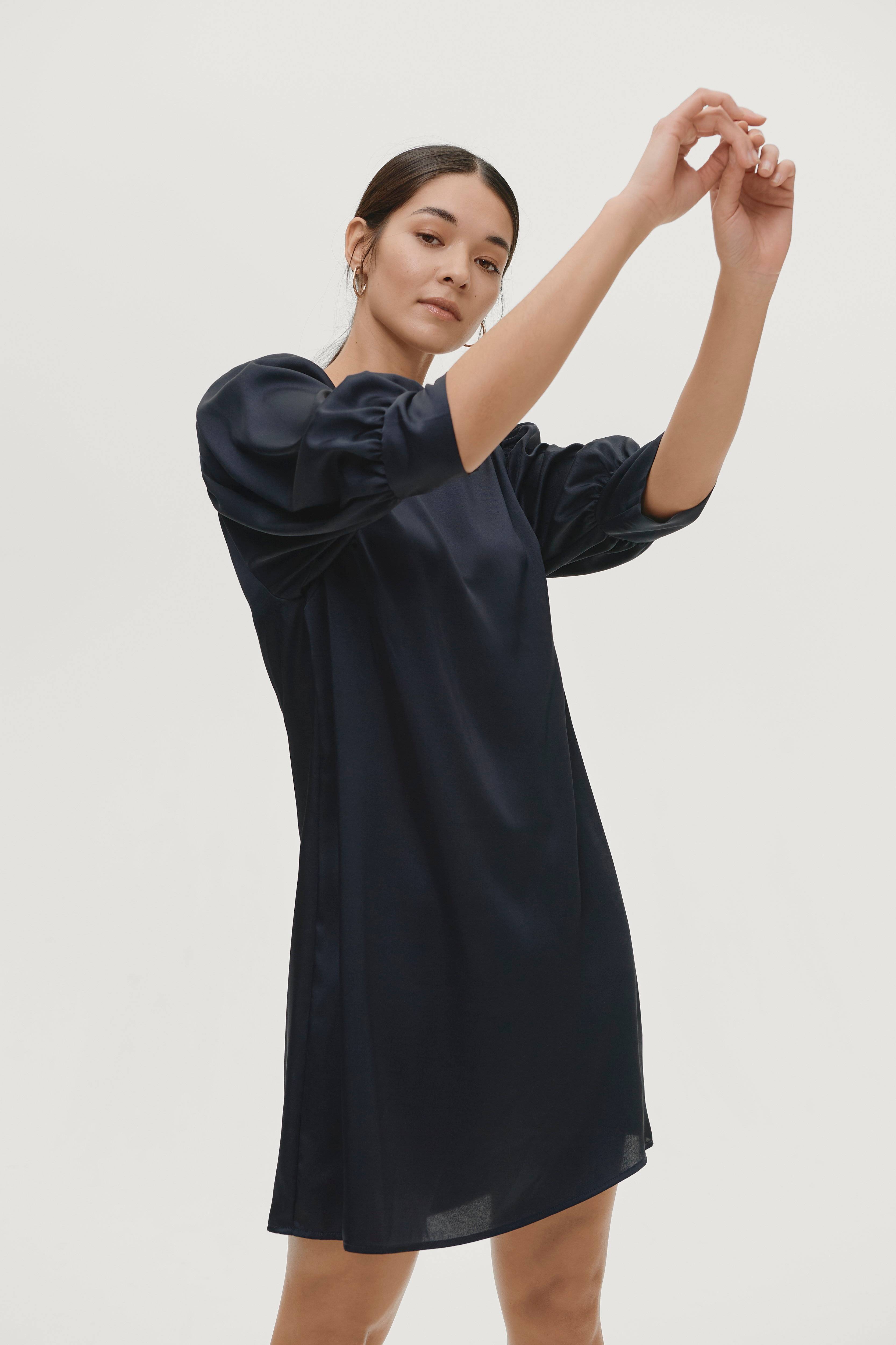 Kjole Marika i vævet kvalitet med glans. Let A-formet model med 3/4-lange pufærmer og rund hals med slids og knap i nakken. Længde ca. 89 cm i str. 36.