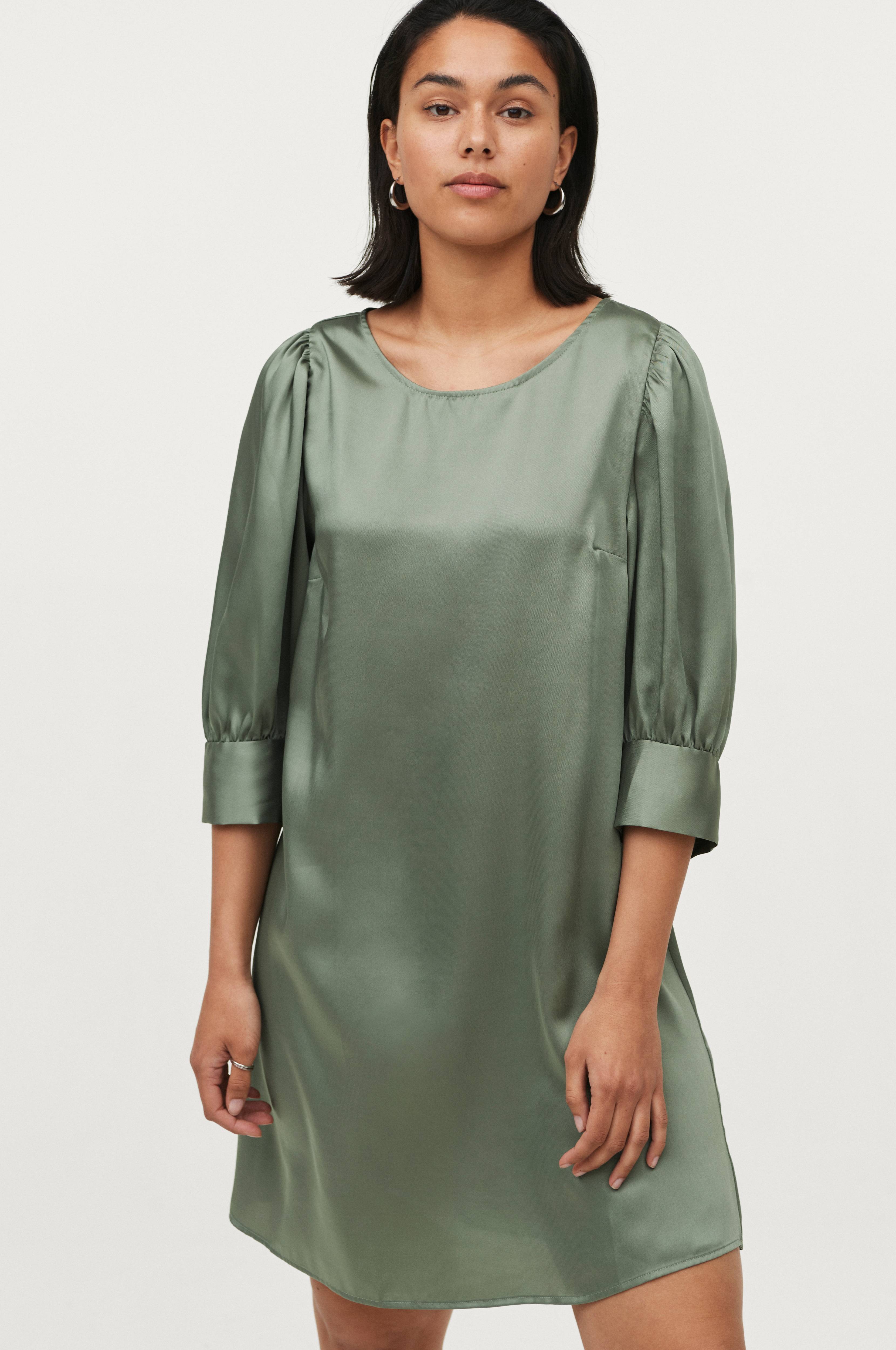 Kjole Marika i vævet kvalitet med glans. Let A-formet model med 3/4-lange pufærmer og rund hals med slids og knap i nakken. Længde ca. 89 cm i str. 36.