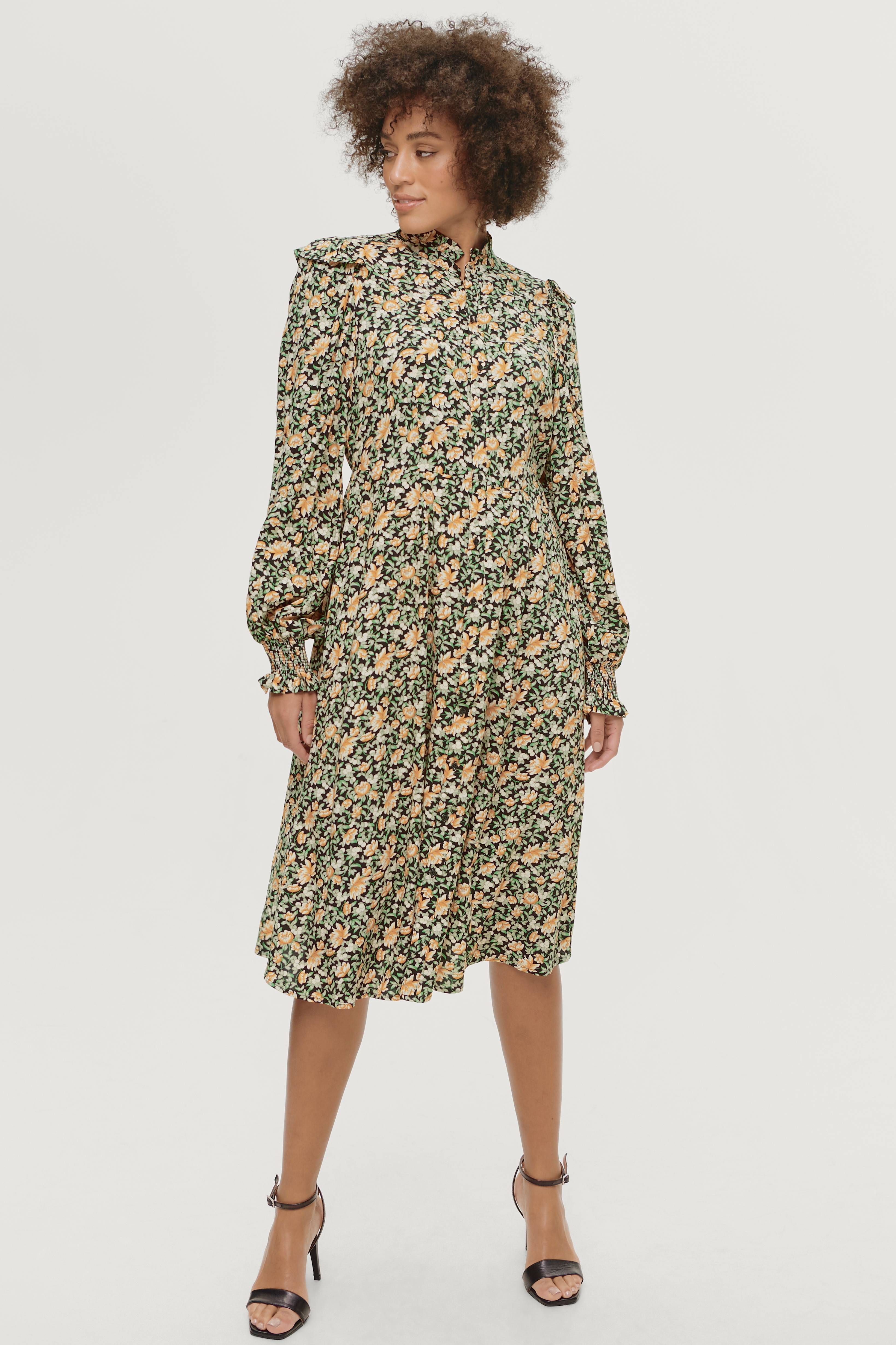 Kjole Mary i vævet kvalitet med blødt fald. Figursyet model med afskæring i taljen og indvendig elastik bagpå. Lukning hele vejen foran og rund hals med lille, påsyet flæsekant. Ekstra lange, vide ærmer med flæse over skulderen og smockelastik i ærmekanterne. Længde ca. 115 cm i str. 36.