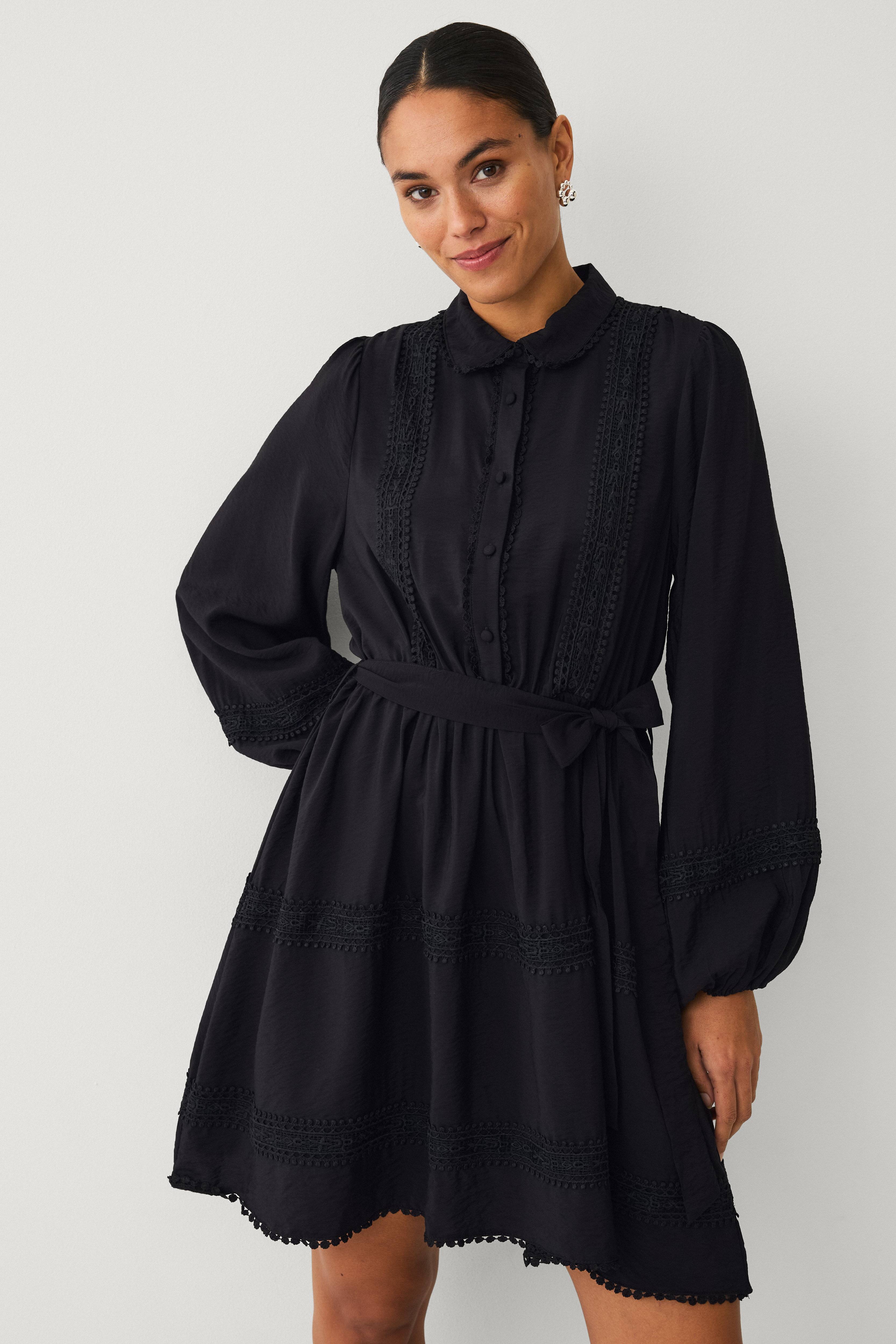 • Kjole i rynket materiale med broderede blondedetaljer• Skjortekrave• Beklædte knapper oppe foran• Lange ballonærmer med elastik ved manchetterne• Elastisk udskæring ved taljen med bindebælte• Længde: 92 cm i størrelse S