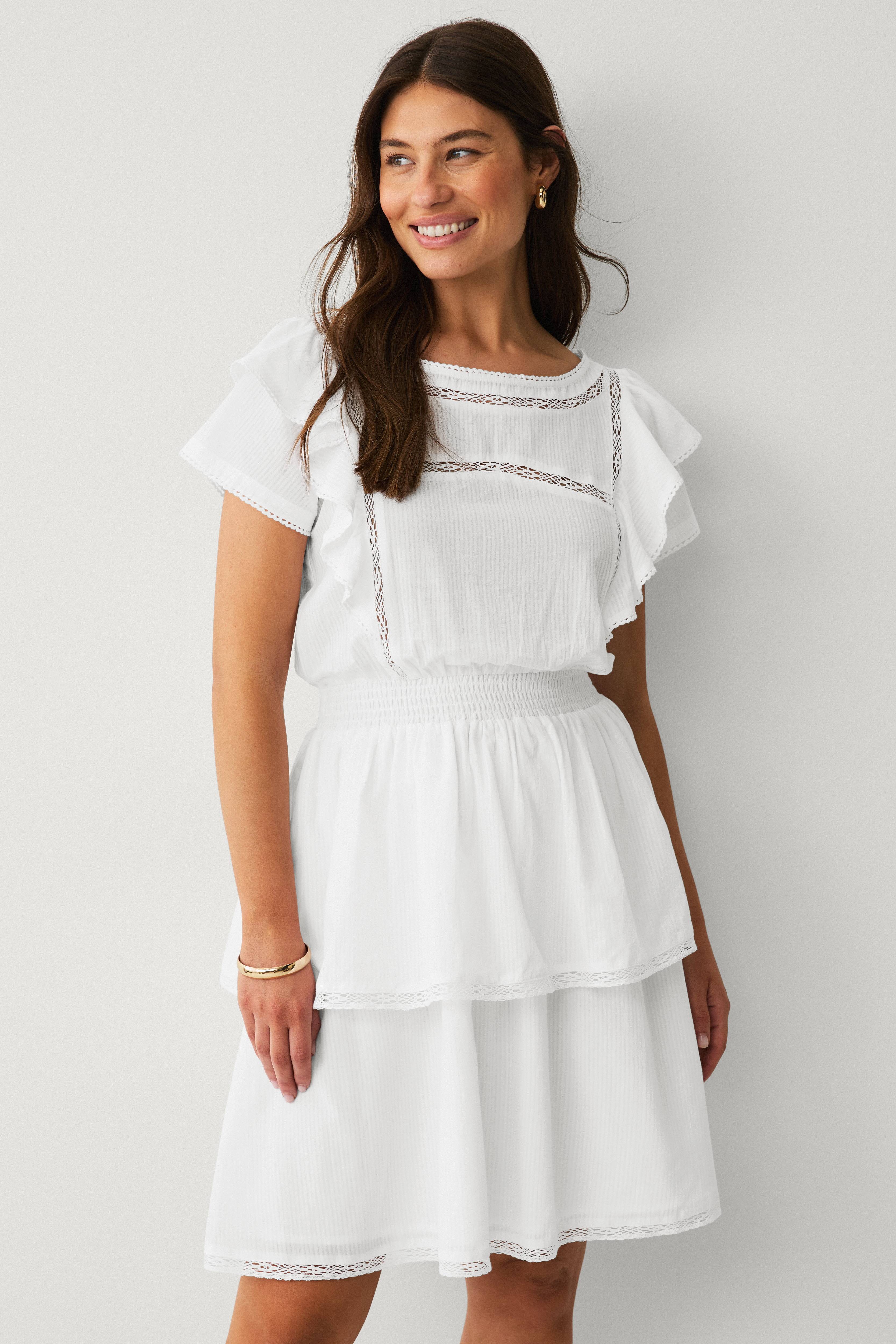 • Kjole med blondedetaljer og volanter• Rund halsudskæring• Korte ærmer• Smock ved taljen• Foret nederdel• Længde: 96 cm i størrelse S