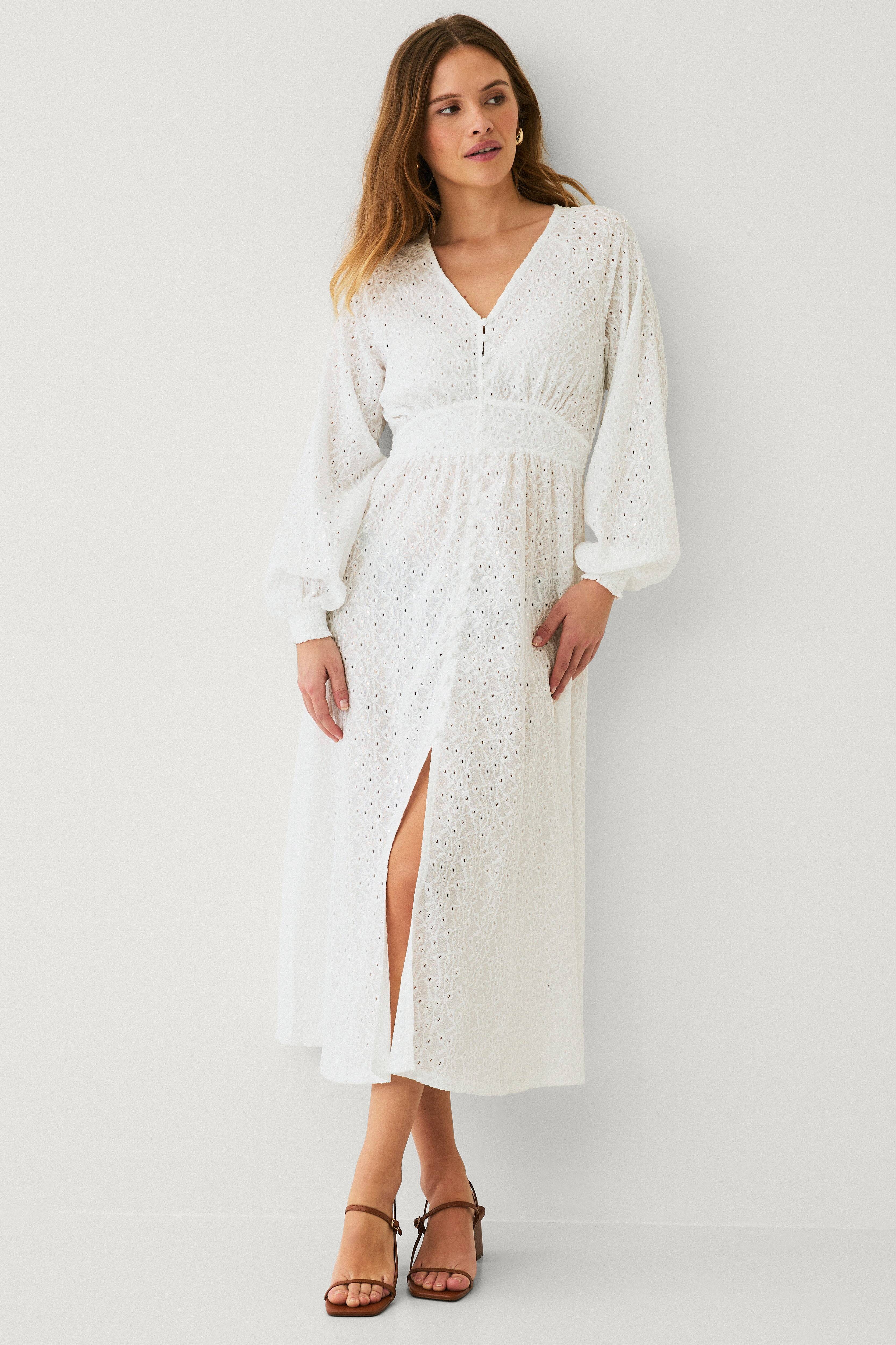 • Midikjole i blød, semitransparent polyesterblanding med hulbroderet mønster • Lange pufærmer med nedsænkede skuldre og smock ved manchetterne • V-formet halsudskæring med kort knapstolpe med beklædte knapper • Talje med dekorative sømme og elastik bagpå • Dekorative, beklædte knapper på den nederste del • Slids midt foran • Længde: 130 cm i størrelse S