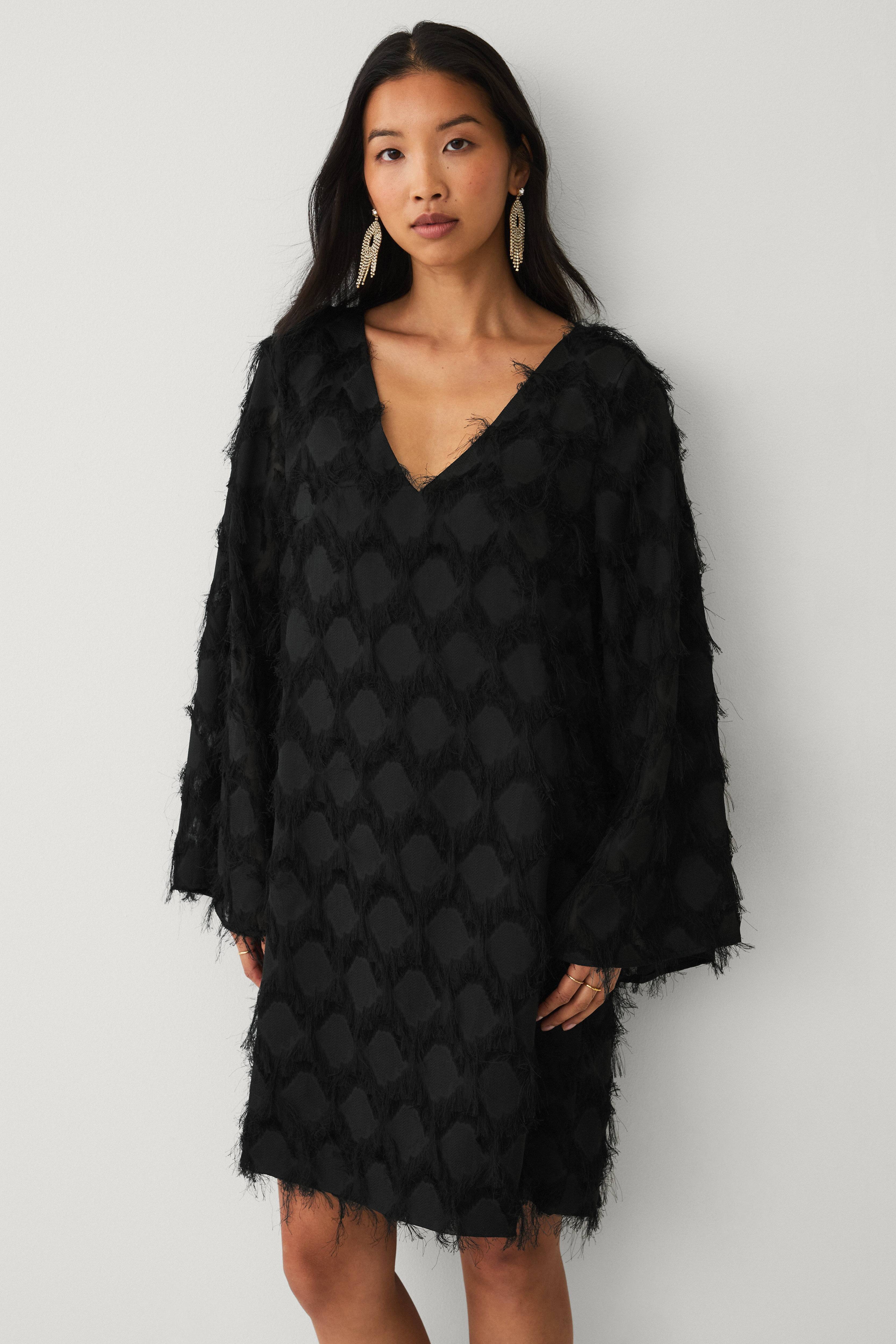 • Kjole med dekorative frynser• V-udskæring• Lange, brede ærmer• Tekstilforing• Normal pasform• Længde: 92 cm i størrelse 38