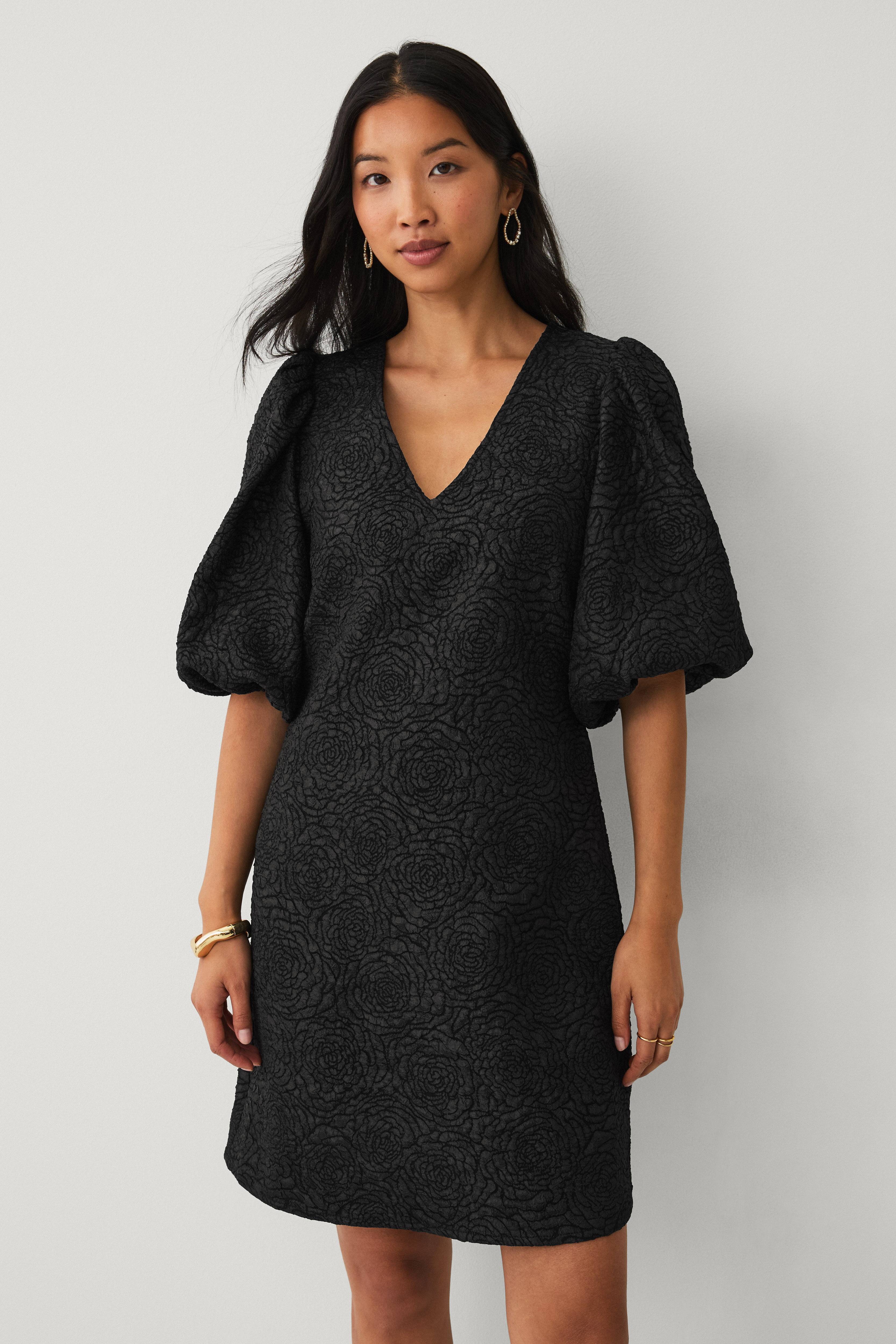 • Kjole med v-formet halsudskæring• Blomstermønster i jacquardvæv• Halvlange ballonærmer med elastik ved manchetterne• Elastik bagpå ved taljen• Længde: 92 cm i størrelse S