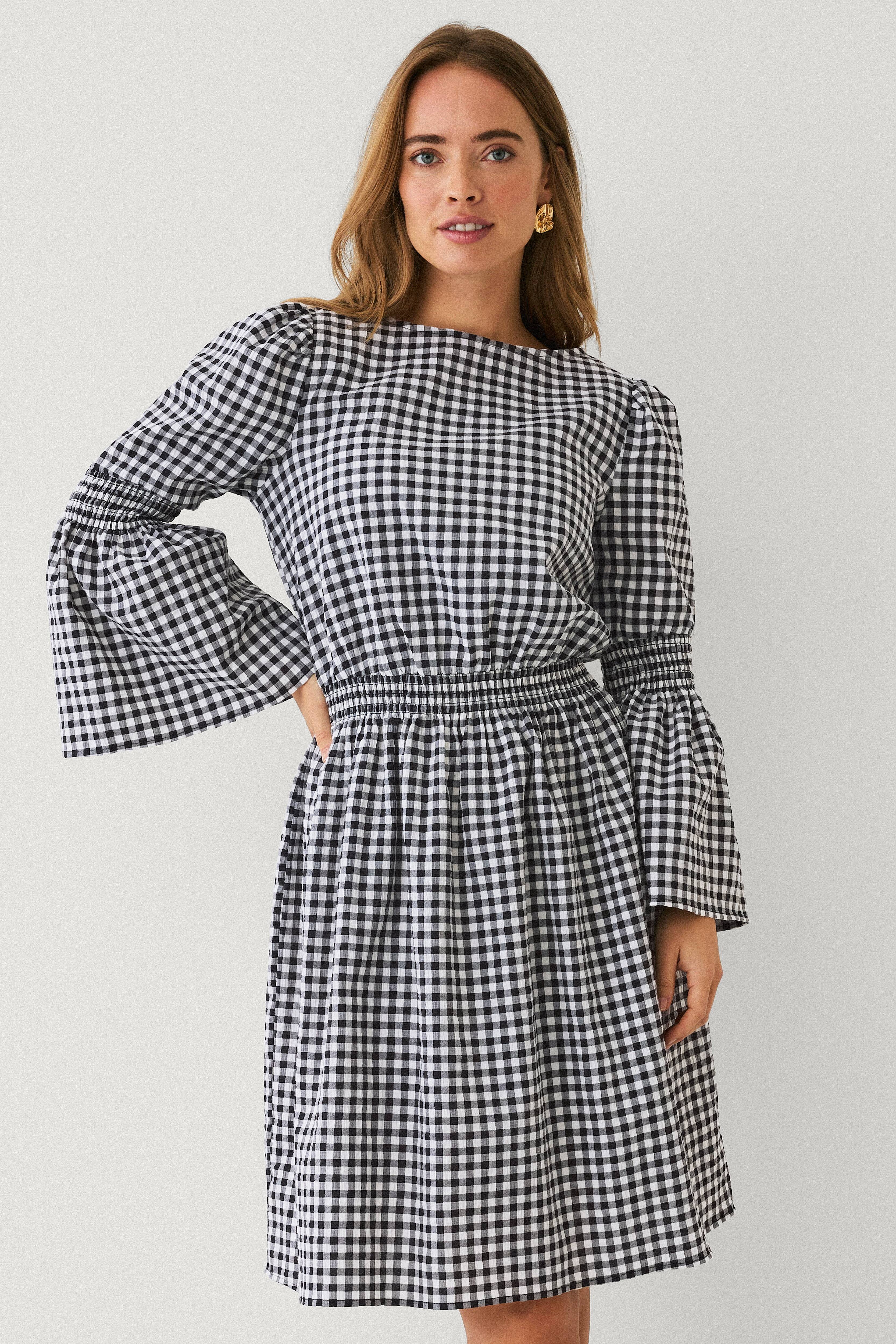 • Figurformede model i crepe• Bred halsudskæring• Elastisk smock ved taljen• Bredt ærme med svaj med elastiksømme• Længde: 101 cm i størrelse S