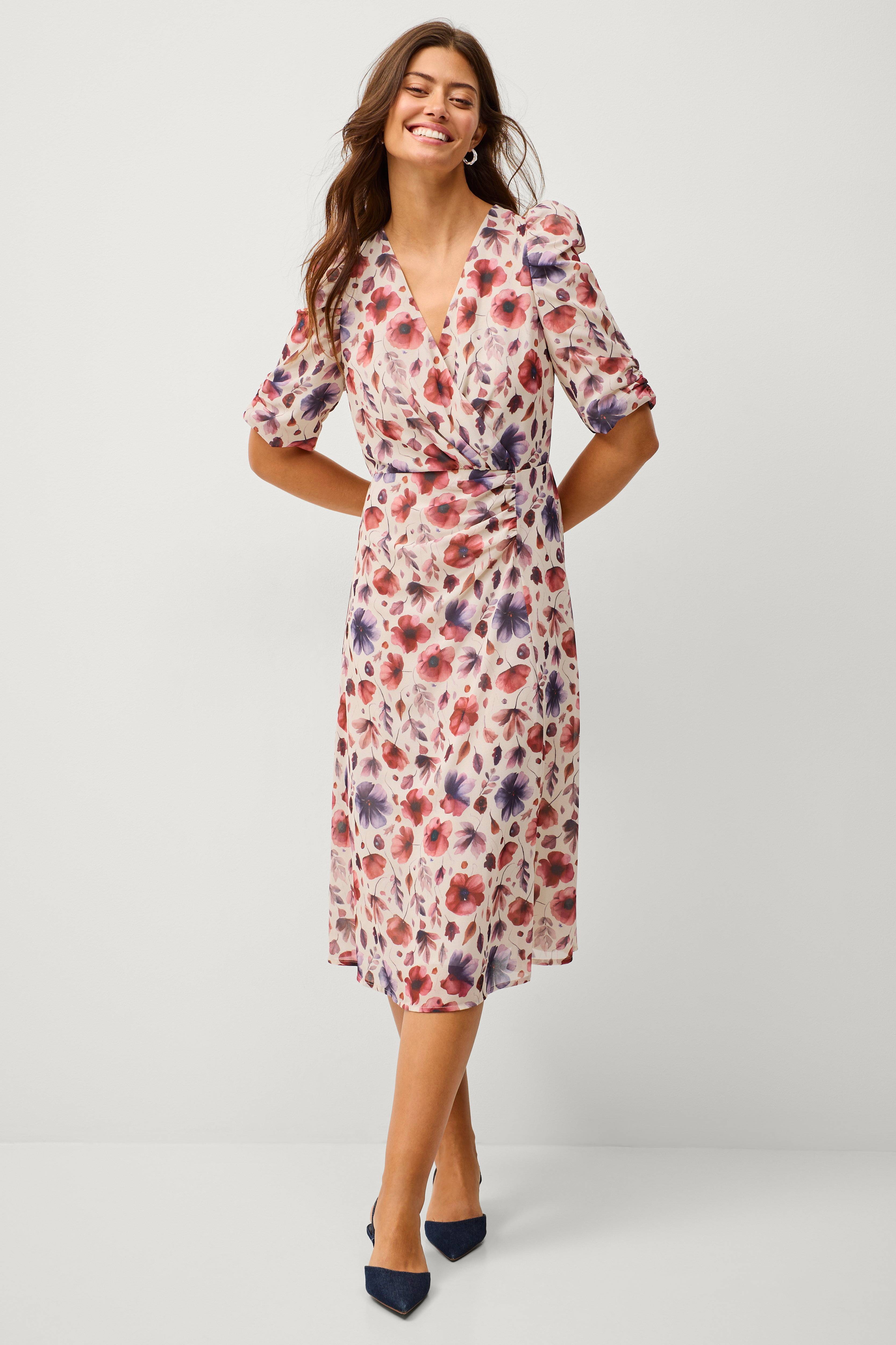 • Blomstret kjole i chiffon• V-udskæring med slå-om• Korte ballonærmer med samling• Skjult lynlås i ryggen• Foret• Lille i størrelsen, vi anbefaler at vælge en størrelse større end din sædvanlige.• Længde: 114 cm i størrelse 36