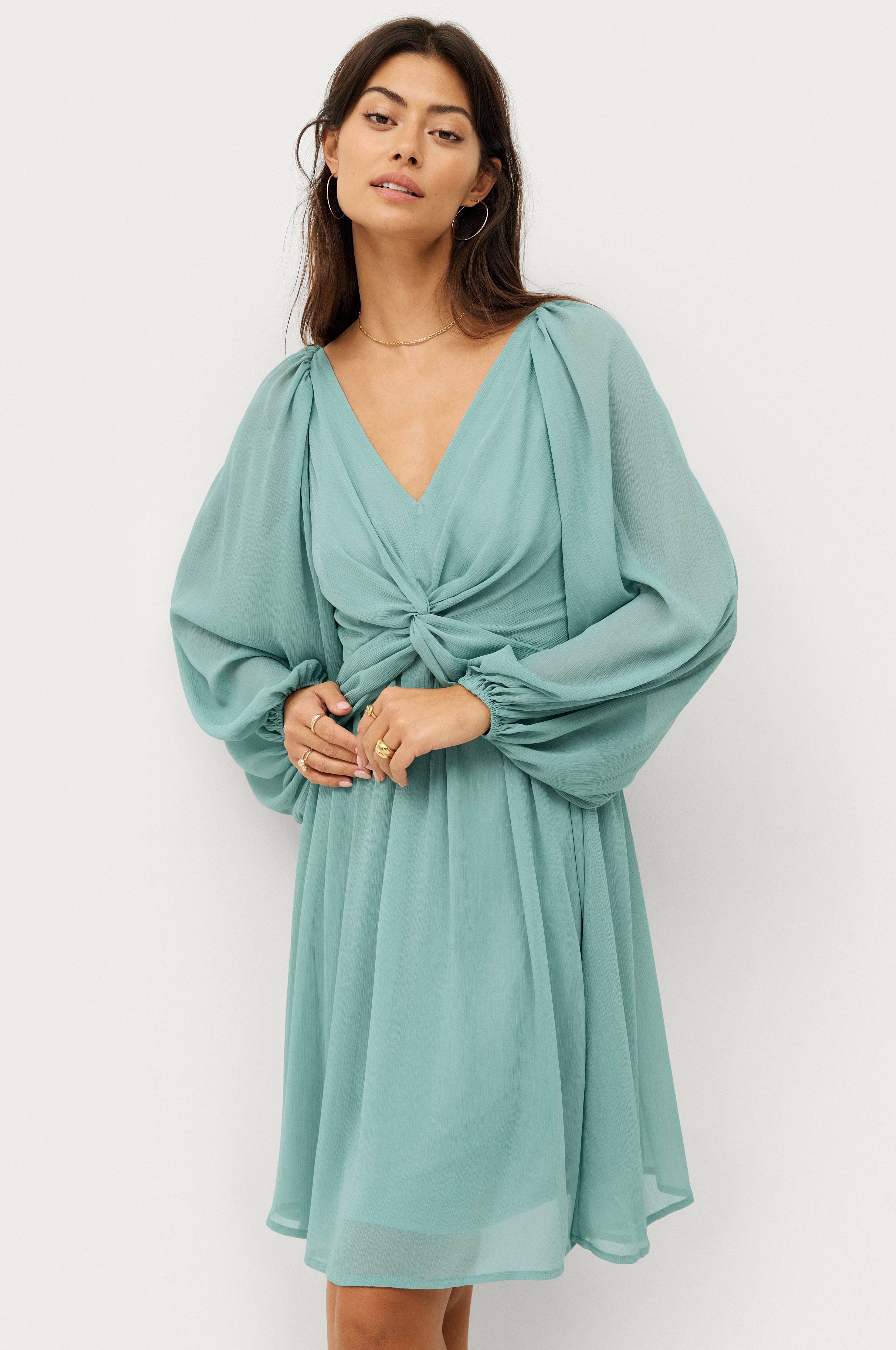 • Kjole i rynket chiffon• V-udskæring• Knudedrapering foran• Ballonærmer med elastiske manchetter• Skjult lynlås i ryggen• Trikotfor• Længde: 96 cm i størrelse 36