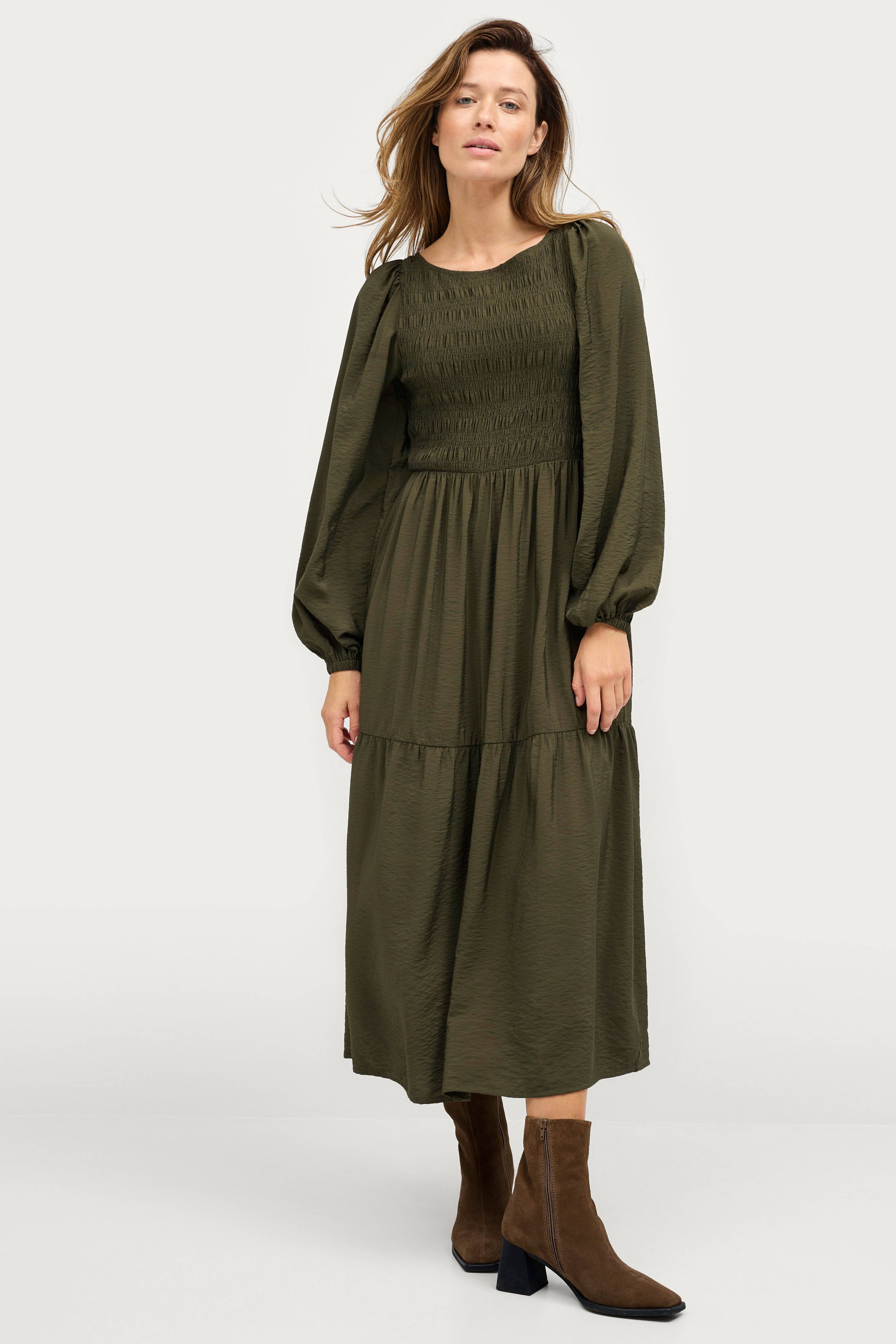 • Store størrelser• Figursyet model med elastisk smock på toppen• Langt ballonærme med elastisk manchet• Bred volant ved nederste kant• Længde: 128 cm i størrelse 34/36