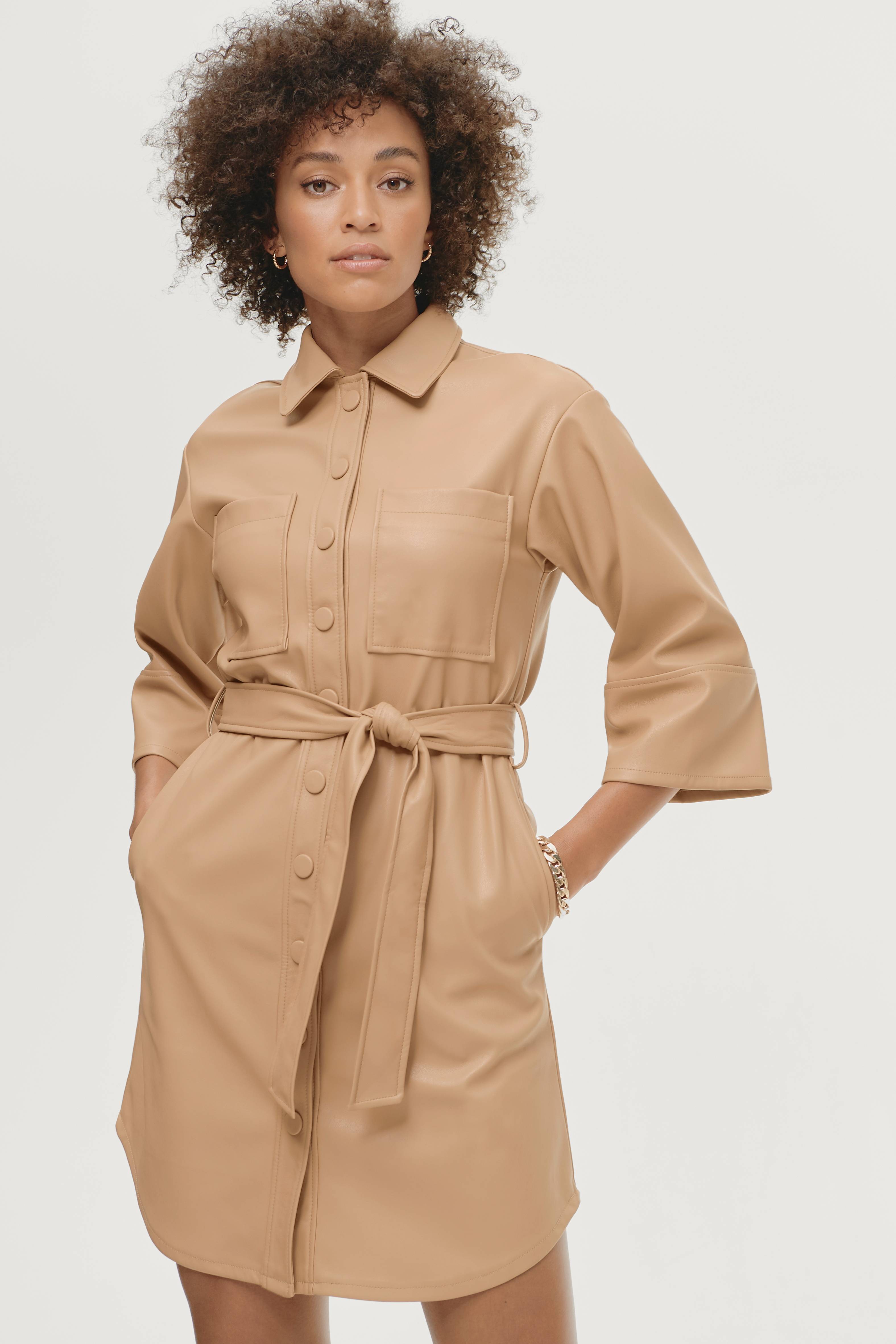 Kjole Olivia i imiteret skind med blød inderside og stretch. Betrukne trykknapper foran, to brystlommer og bindebælte i taljen. 3/4-lange ærmer. Lige pasform. Længde ca. 94 cm i str. 36.