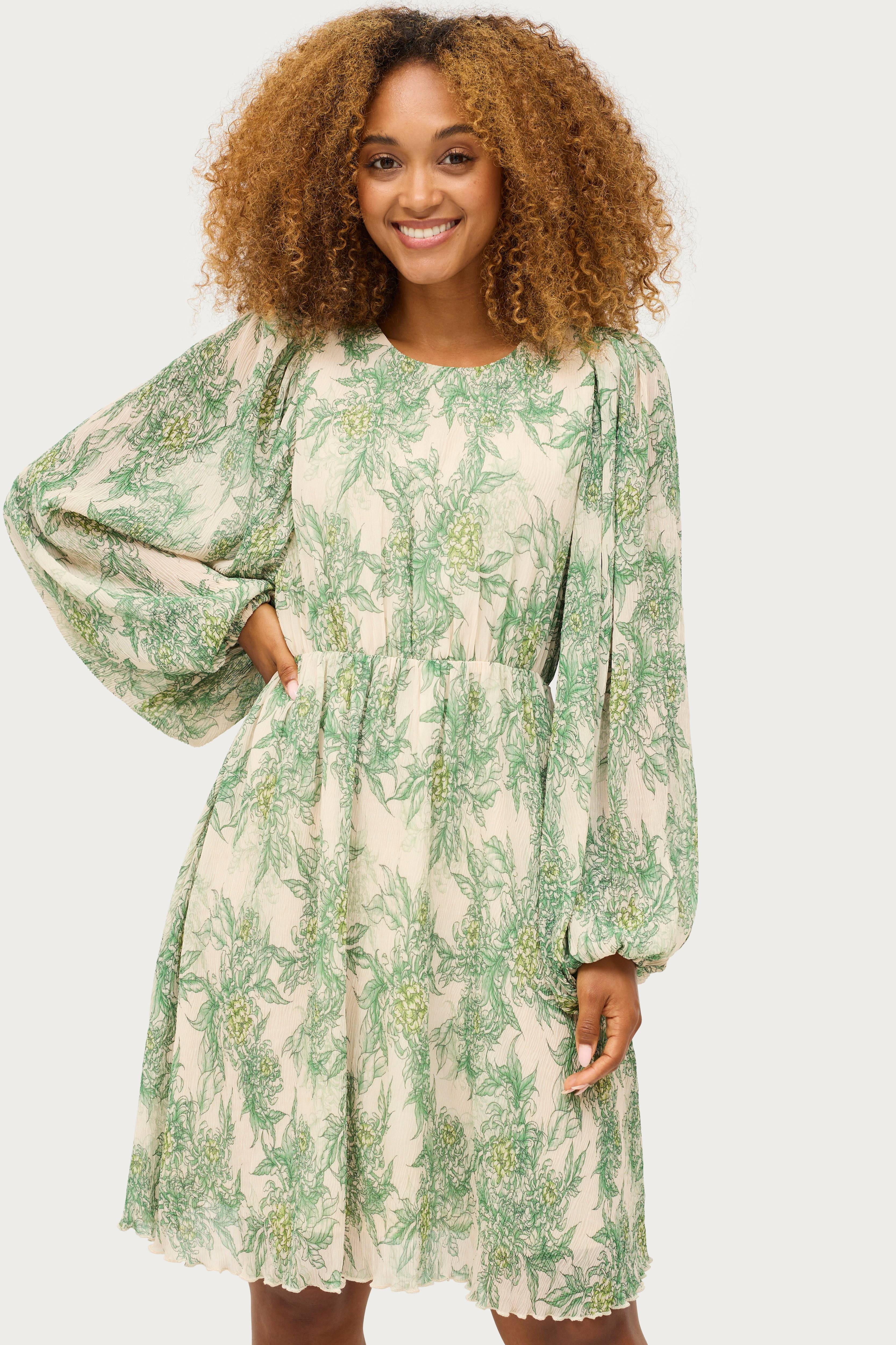 • Mønstret kjole i rynket chiffon• Elastisk talje• Voluminøse ballonærmer med elastiske manchetter• Ventilation med knap i nakken• Trikotfor• Længde: 96 cm i størrelse 34/36