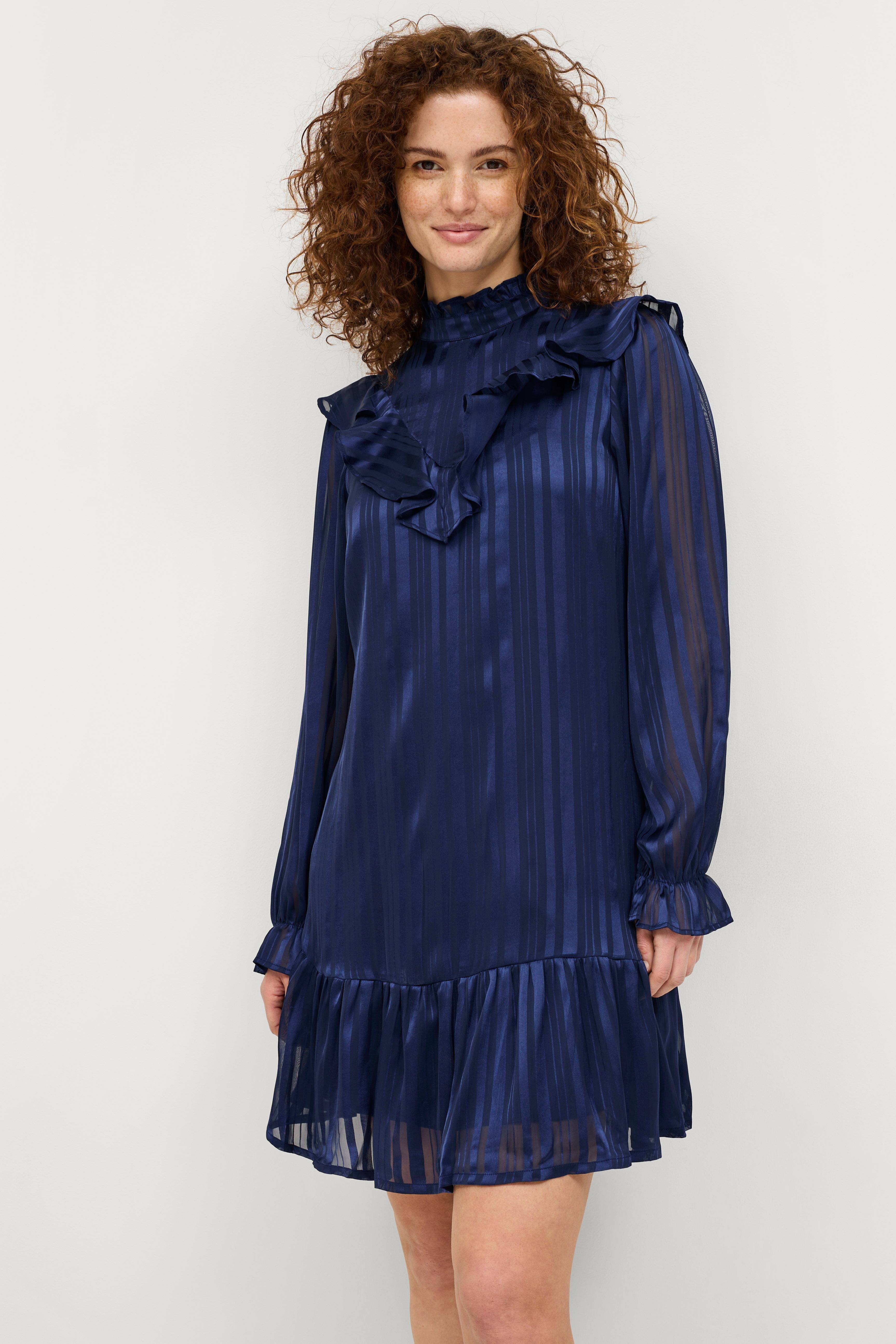 • Kjole med volanter• Opretstående krave med volant• Ventilation med knapper i nakken• Transparente ballonærmer med volant ved manchetterne• Stribet, transparent materiale med glans• Foret• Længde: 93 cm i størrelse 34/36