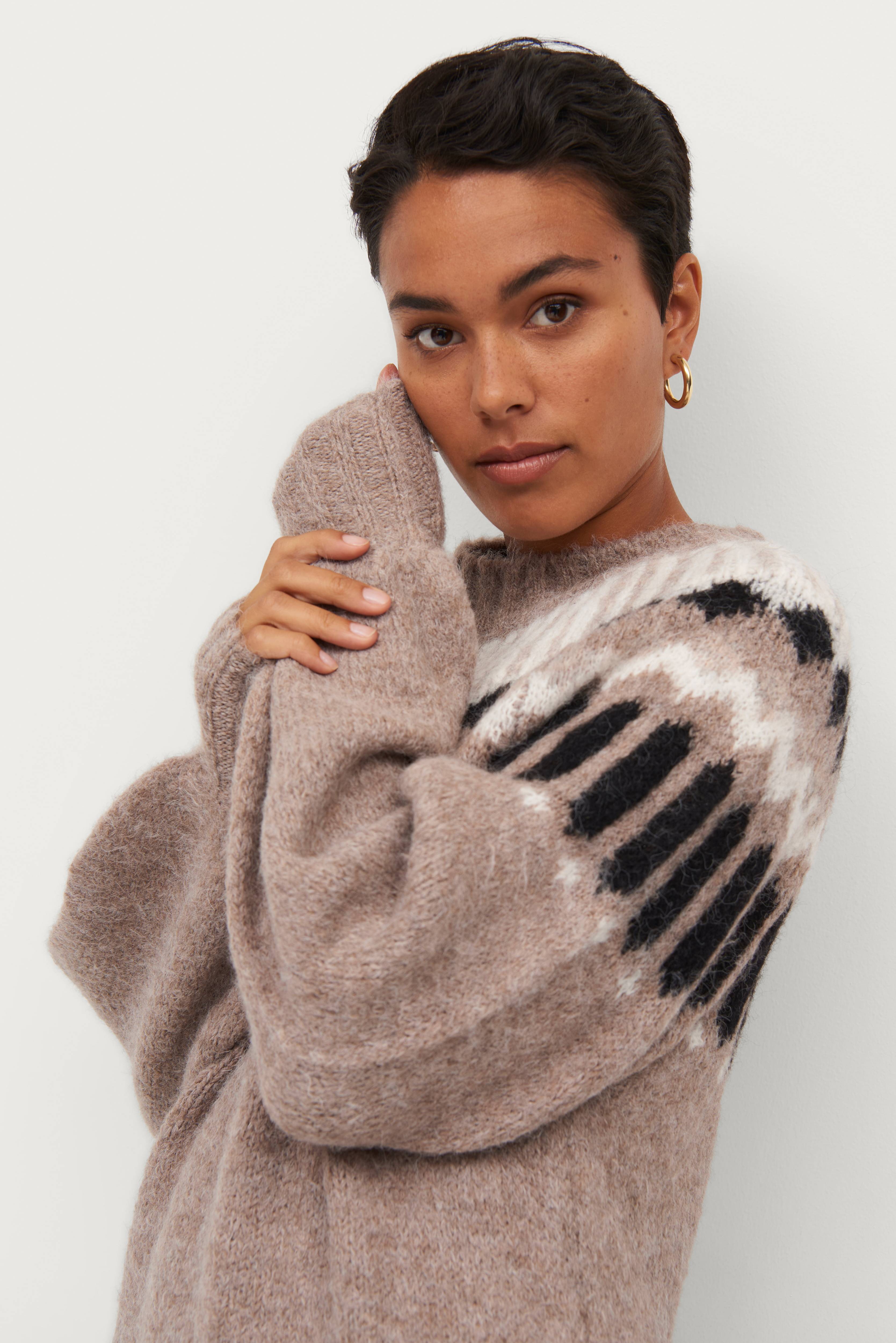 • Strikket oversize model• Strikket mønster på toppen• Høj, ribstrikket krave• Manchet i rib ved manchetterne og nederst• Længde: 94 cm i størrelse 34/36