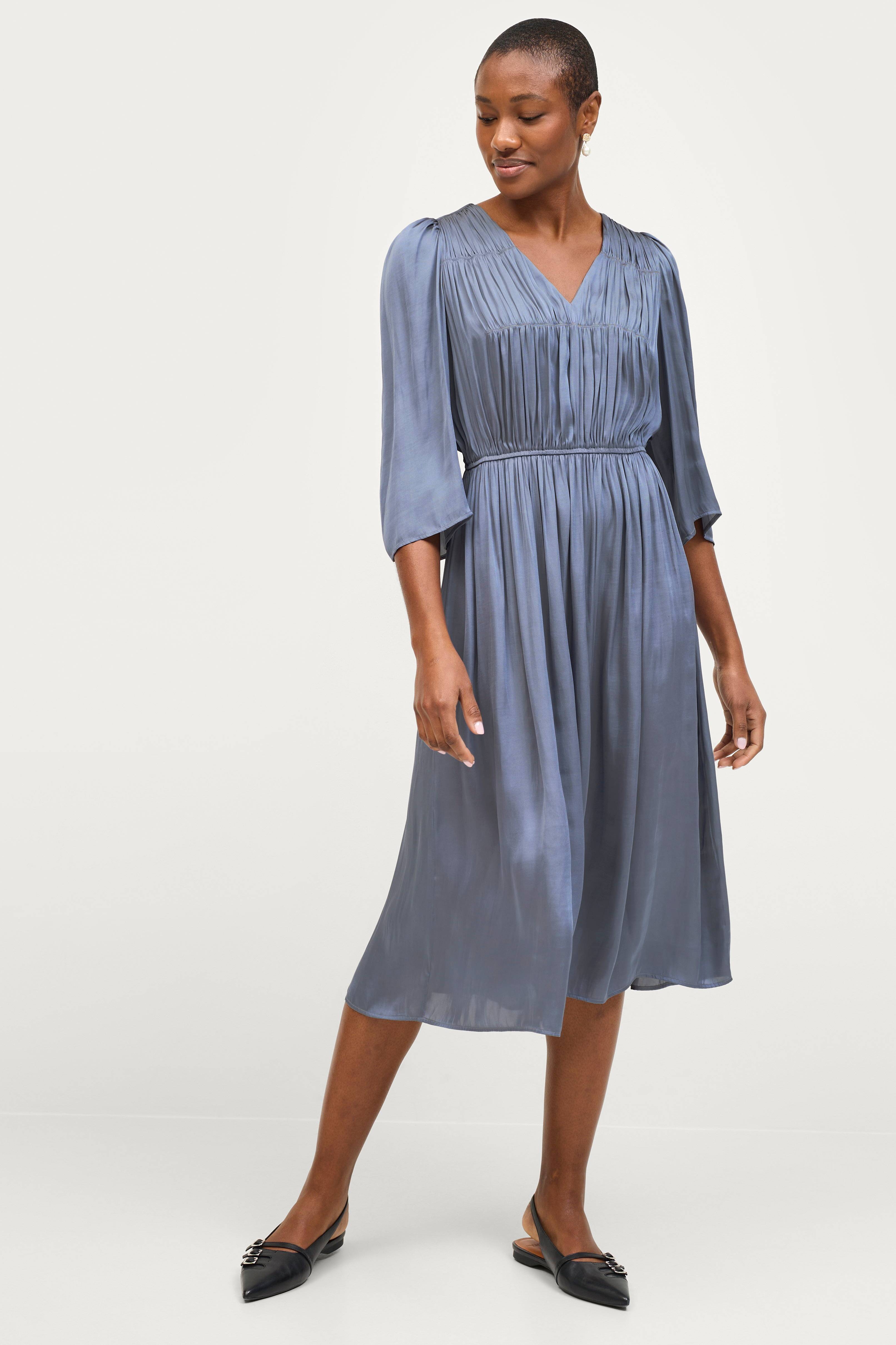 • Kjole i skinnende materiale • Samling ved fronten og bagved • Elastiksømme oppe foran • Elastisk talje • 3/4 lange ballonærmer • Længde: 117 cm i størrelse 34/36 • Produktet indeholder genindvundet materiale, som genbruges for at reducere mængden af affald samtidigt med at der ikke anvendes nye ressourcer.