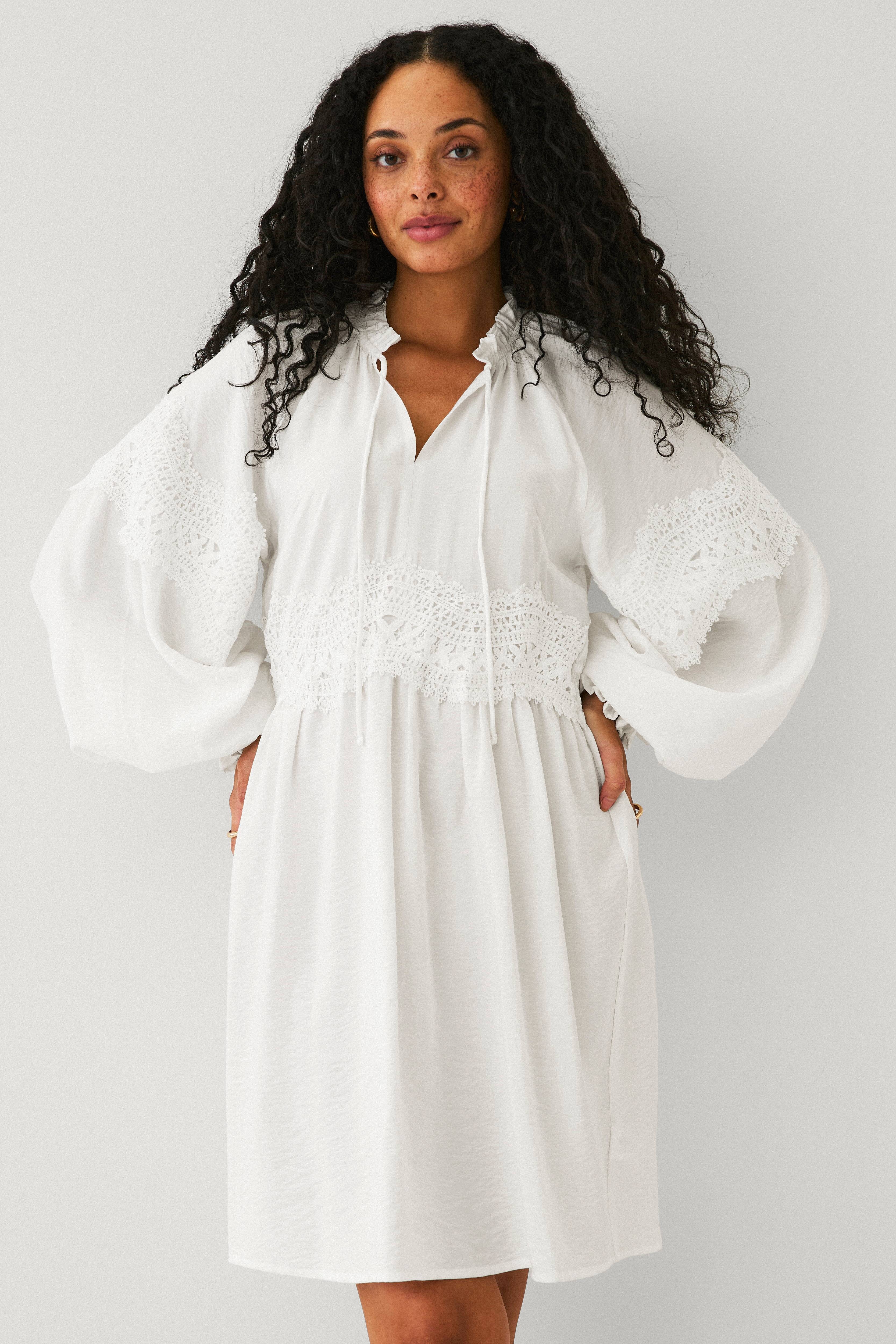 • Let figurformet model• Rund hals med flæsekant og bindebånd foran• Elastisk smock bagpå ved taljen• Ekstra bredt raglanærme med elastik nederst• Længde: 94 cm i størrelse S
