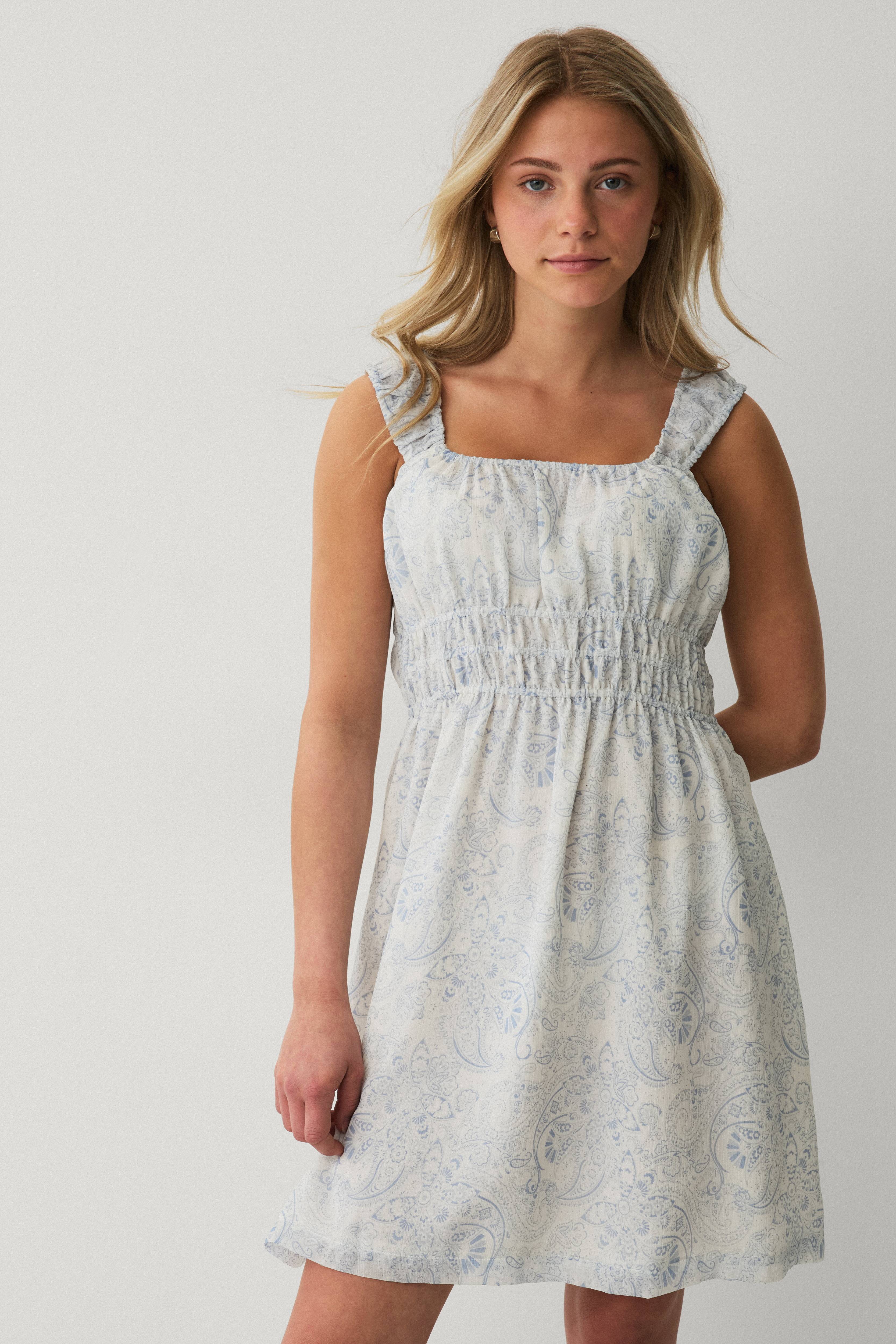 • Ærmeløs model i chiffon crepe• Indlagt elastik i halsen, omkring ærmegabene, på skulderstropperne og ved taljen• Åben ryg med brede, elastiske bånd ovenpå• Foret