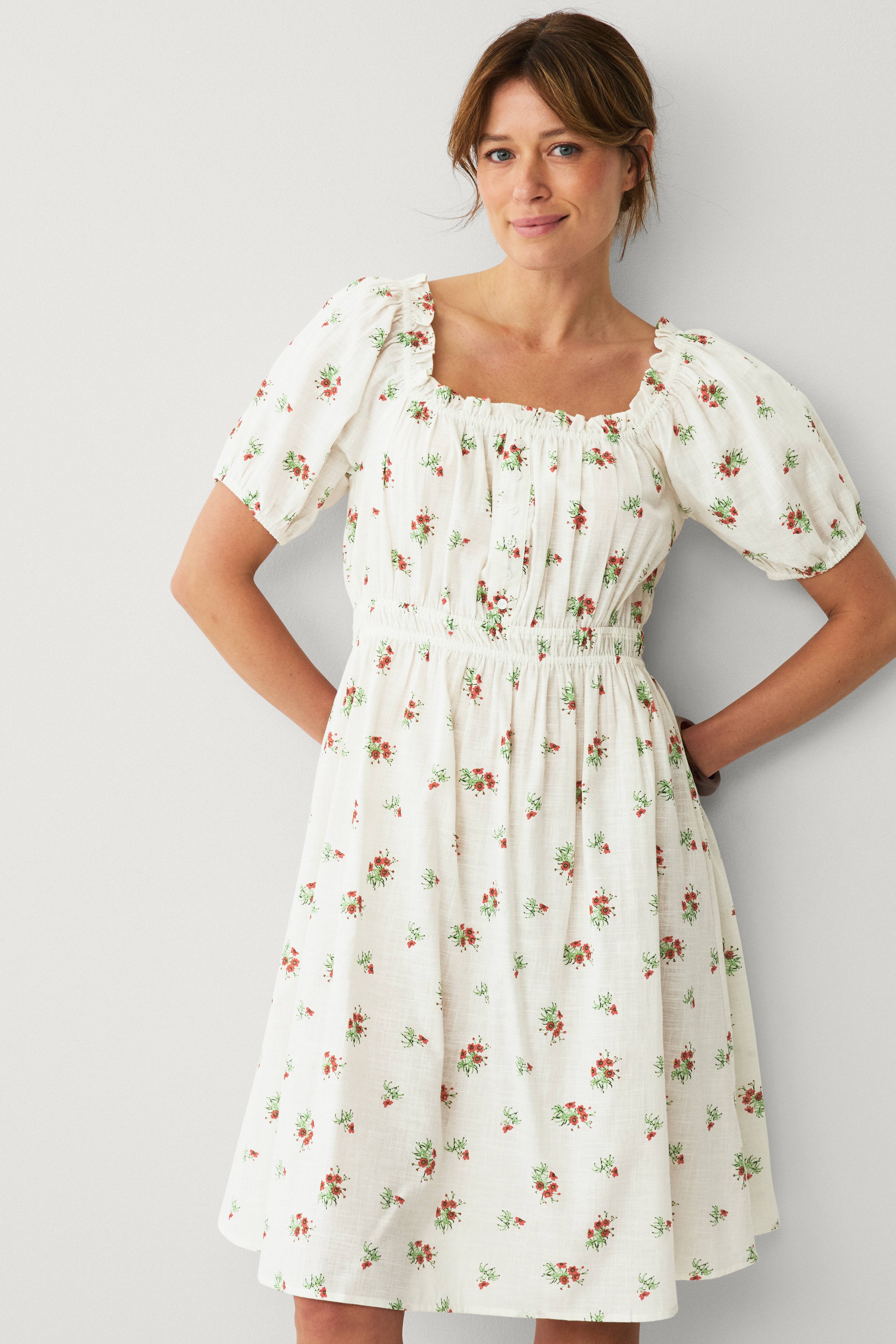 • Figurformede model med elastik ved taljen • Bred, elastisk halsudskæring • Dekorationsknapper oppe foran • Kort, raglan-skåret ærme med elastik ved manchetterne • Længde: 102 cm i størrelse S
