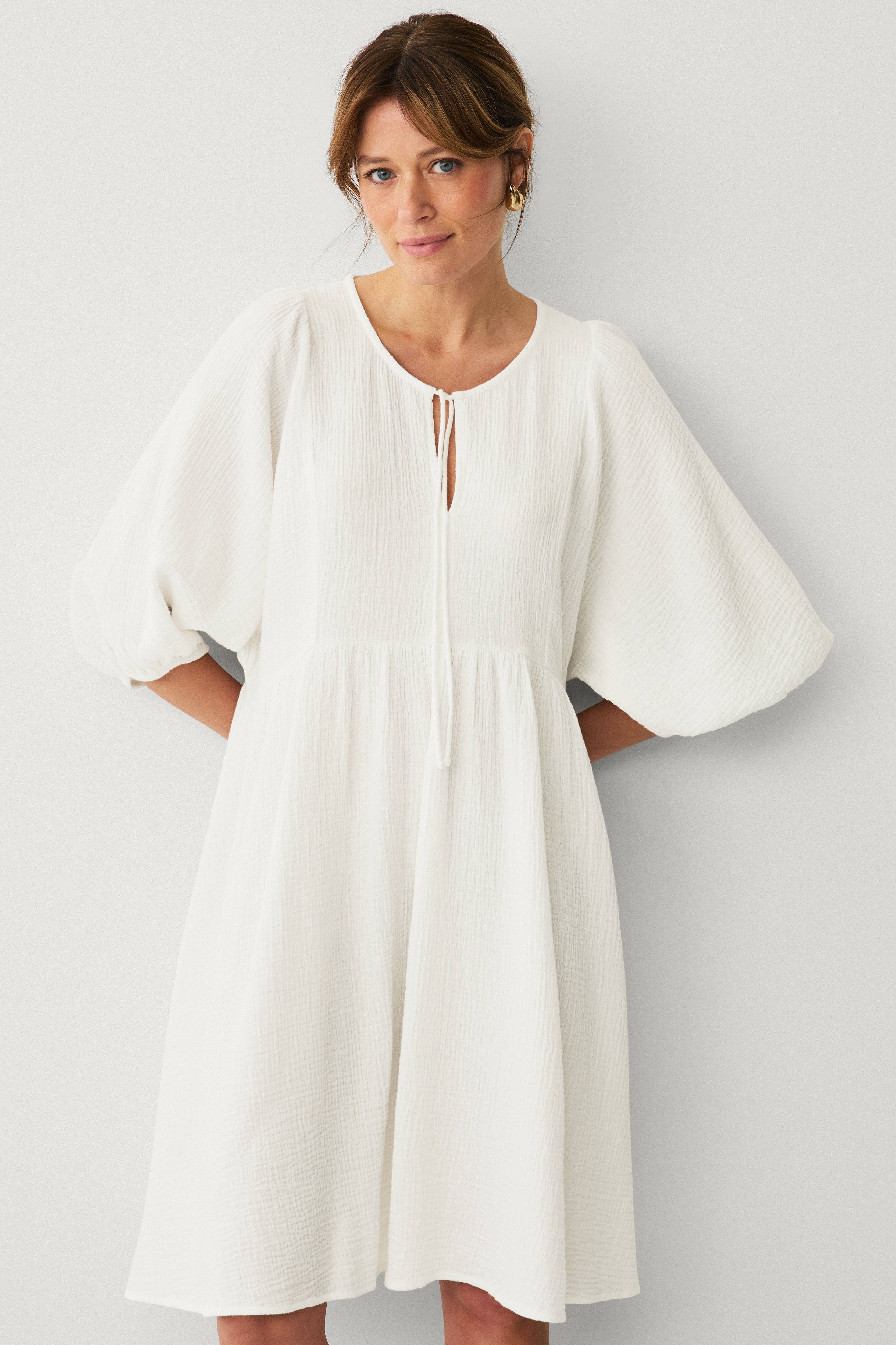 Jeg er gravid og kan have den på, dog sidder den lidt stramt om brystet, men den er super behagelig, og man bliver ikke varm i den! Nemt det bedste køb af en hvid kjole!!!
