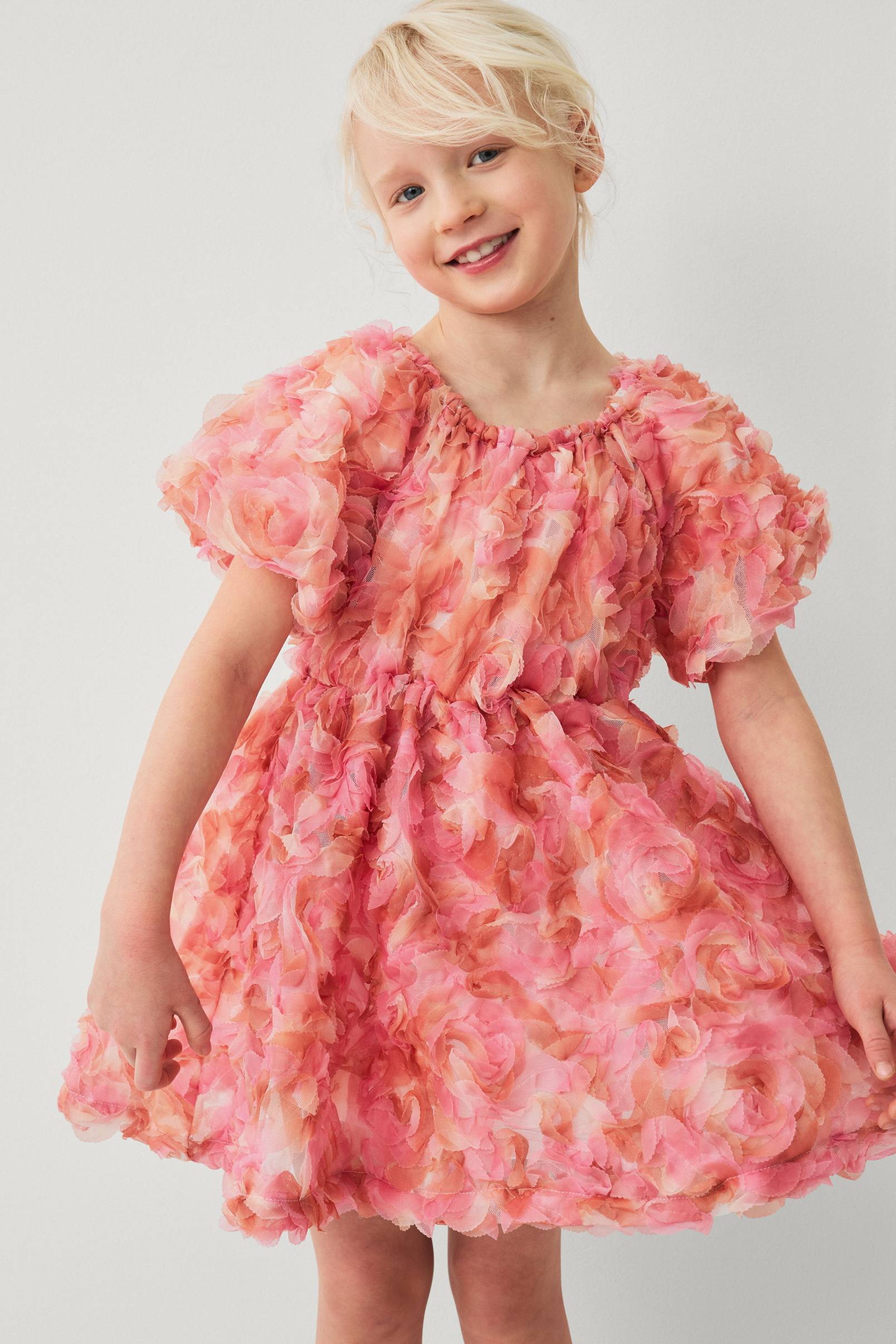 • Foret kjole i mesh med 3D-blomster• Rund, elastisk halsudskæring• Korte ballonærmer med elastik ved manchetterne• Elastik ved taljen• Elastisk for