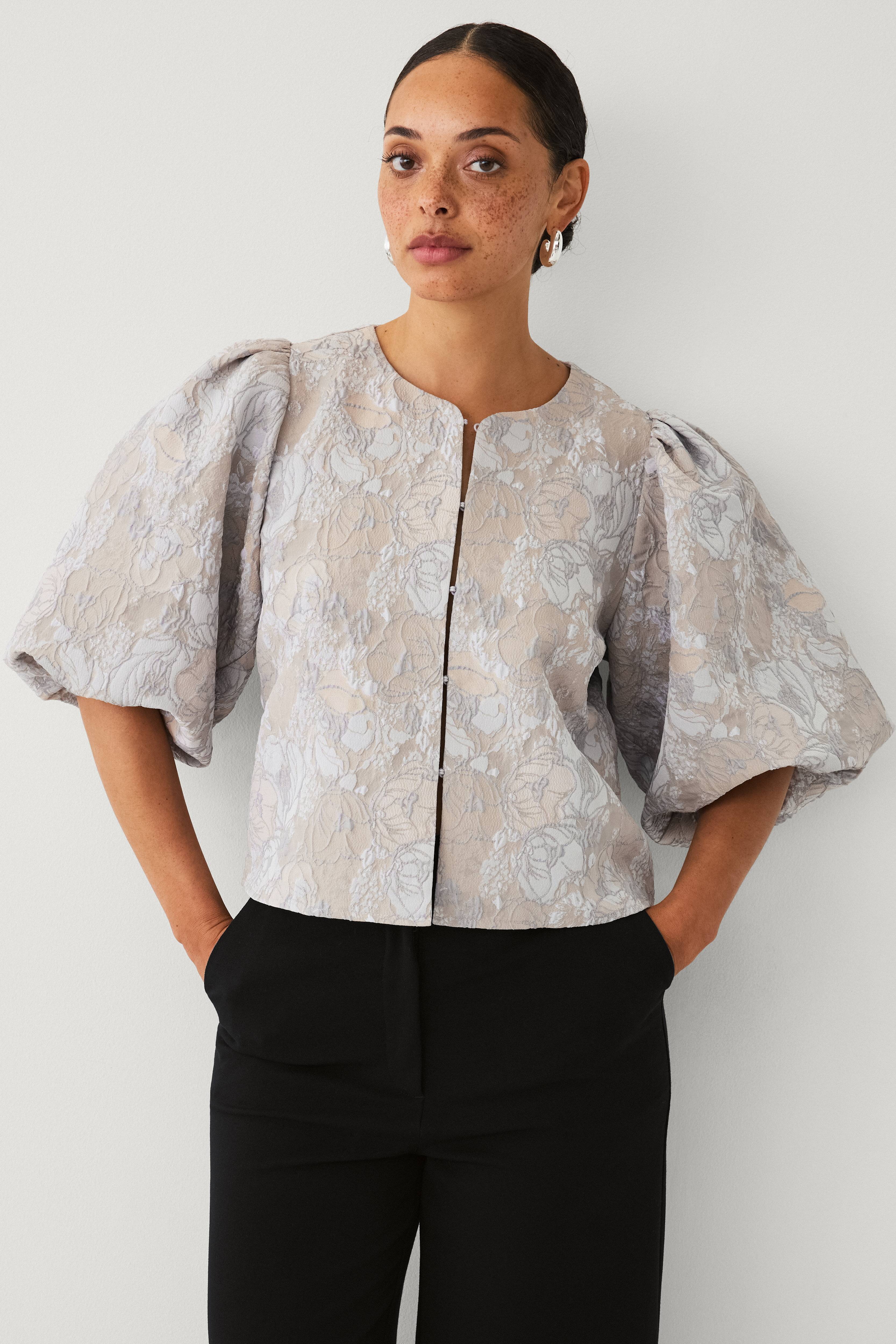 • Lige design• Rund halsudskæring• Halvlange, brede pufærmer• Knapstolpe med skjulte spændelukninger foran• Afslappet pasform• Længde: 52 cm i størrelse S