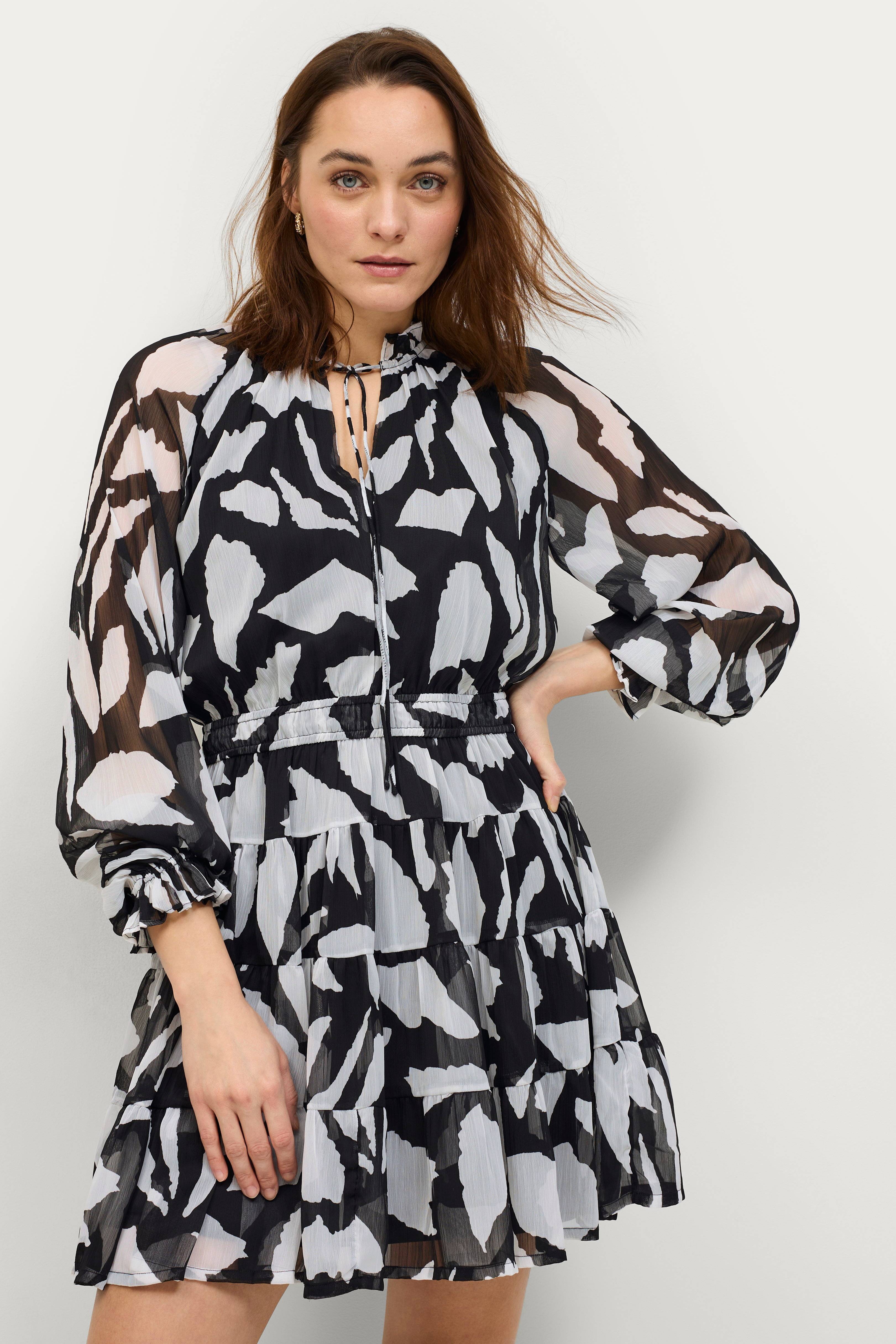 • Store størrelser• V-udskæring med bindbart bånd• Volant i halsen• Transparente ballonærmer med volant ved manchetterne• Elastisk talje• Nederdel med svaj med volanter• Trikotfor• Længde: 95 cm i størrelse 34/36