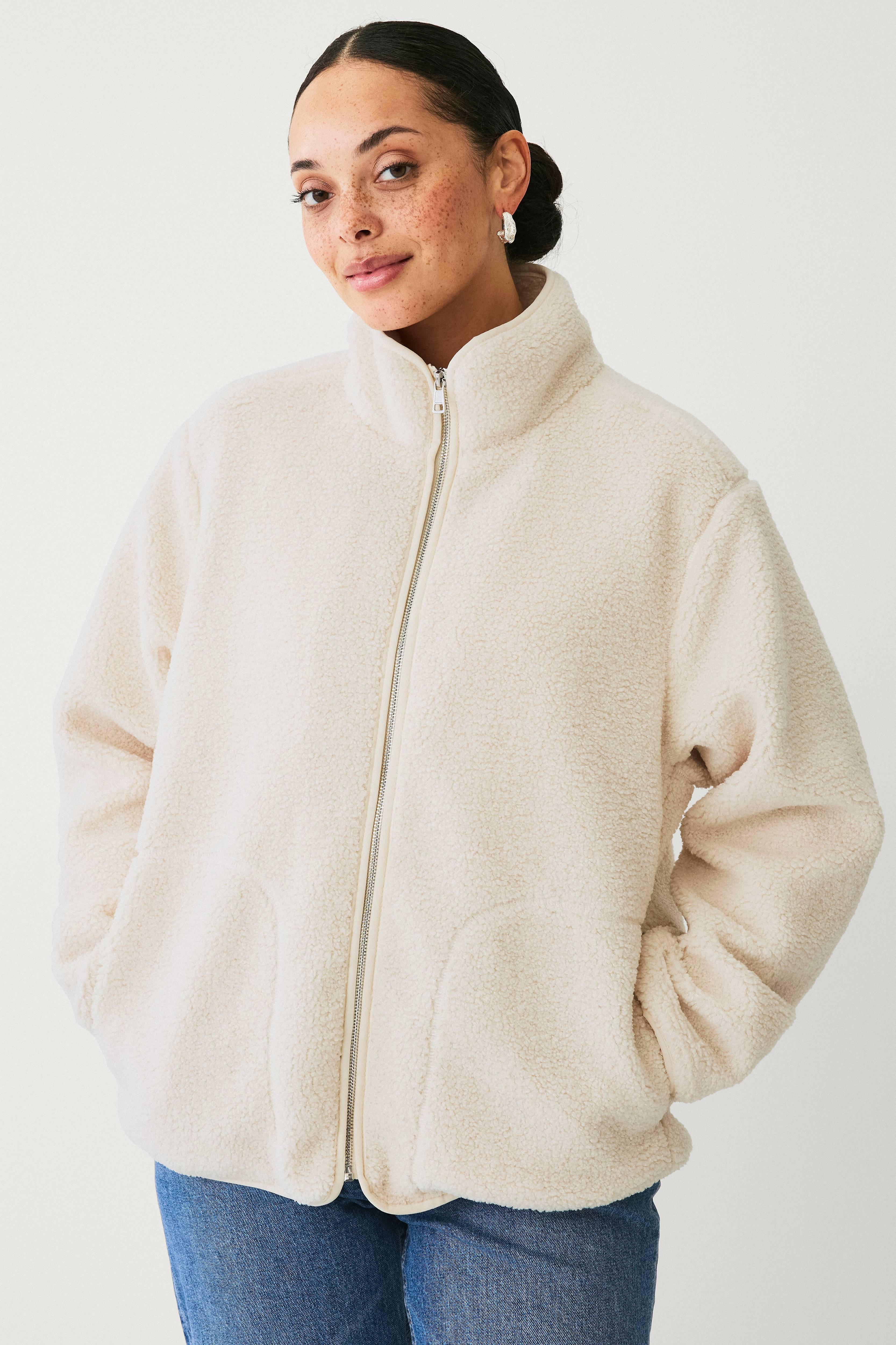 • Kort fleecejakke • Oversize model med høj krave • Fuld længde lynlås • To lommer • Bløde, tynde elastikkanter ved ærmeafslutningerne, nederst og på kraven • Længde: 64 cm i størrelse S