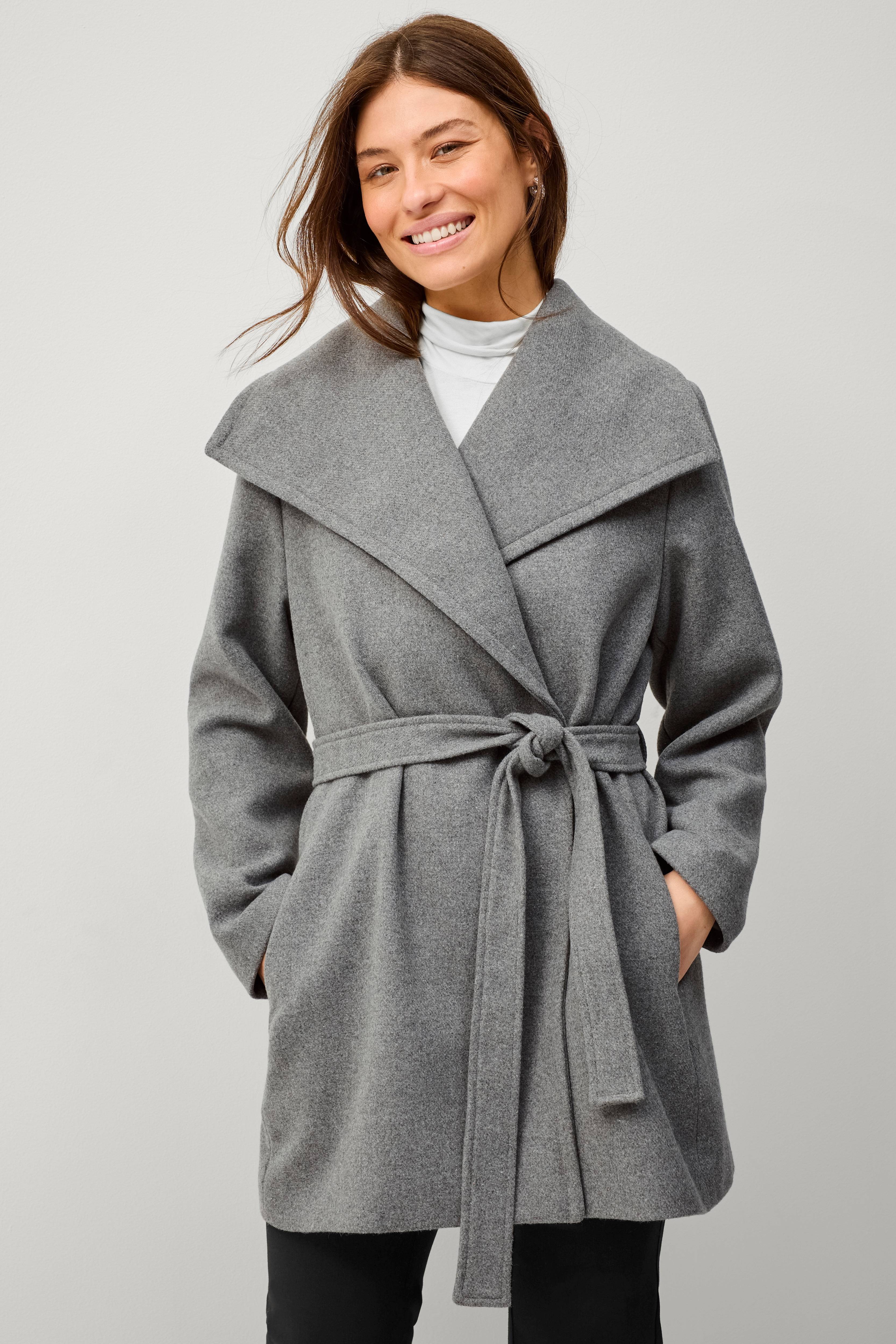 • Jakke i uldmiks• Stilren model• Sjalskrave• Skjulte trykknapper• Sidelommer• Bindebælte• Vævet for• Længde: 85 cm i størrelse 38/40