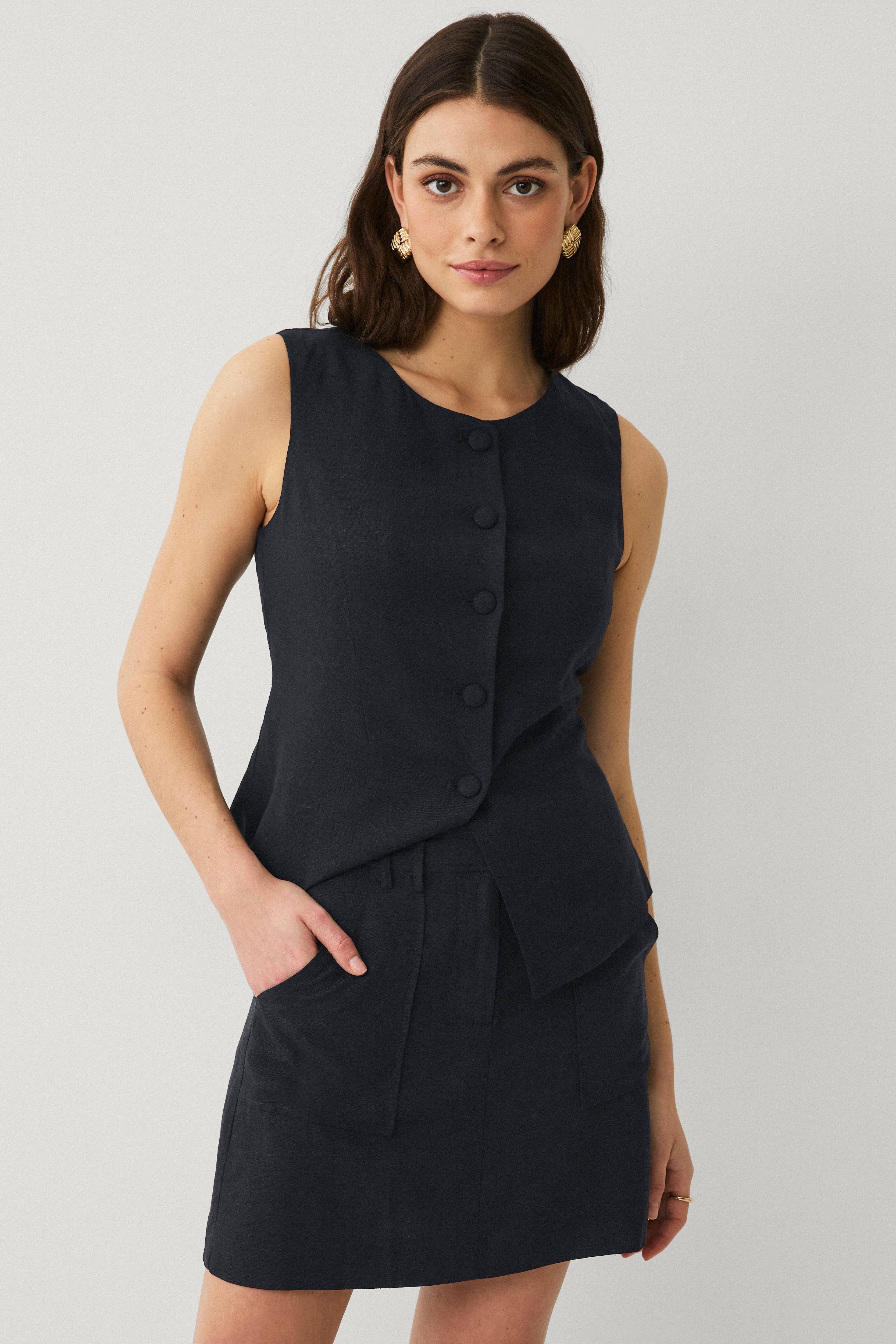 • Kort nederdel med normalhøj talje• Skjult lukning med bøjle og krog og knap• Stropper• Gylp med lynlås• Sidelommer• Længde: 44 cm i størrelse 36