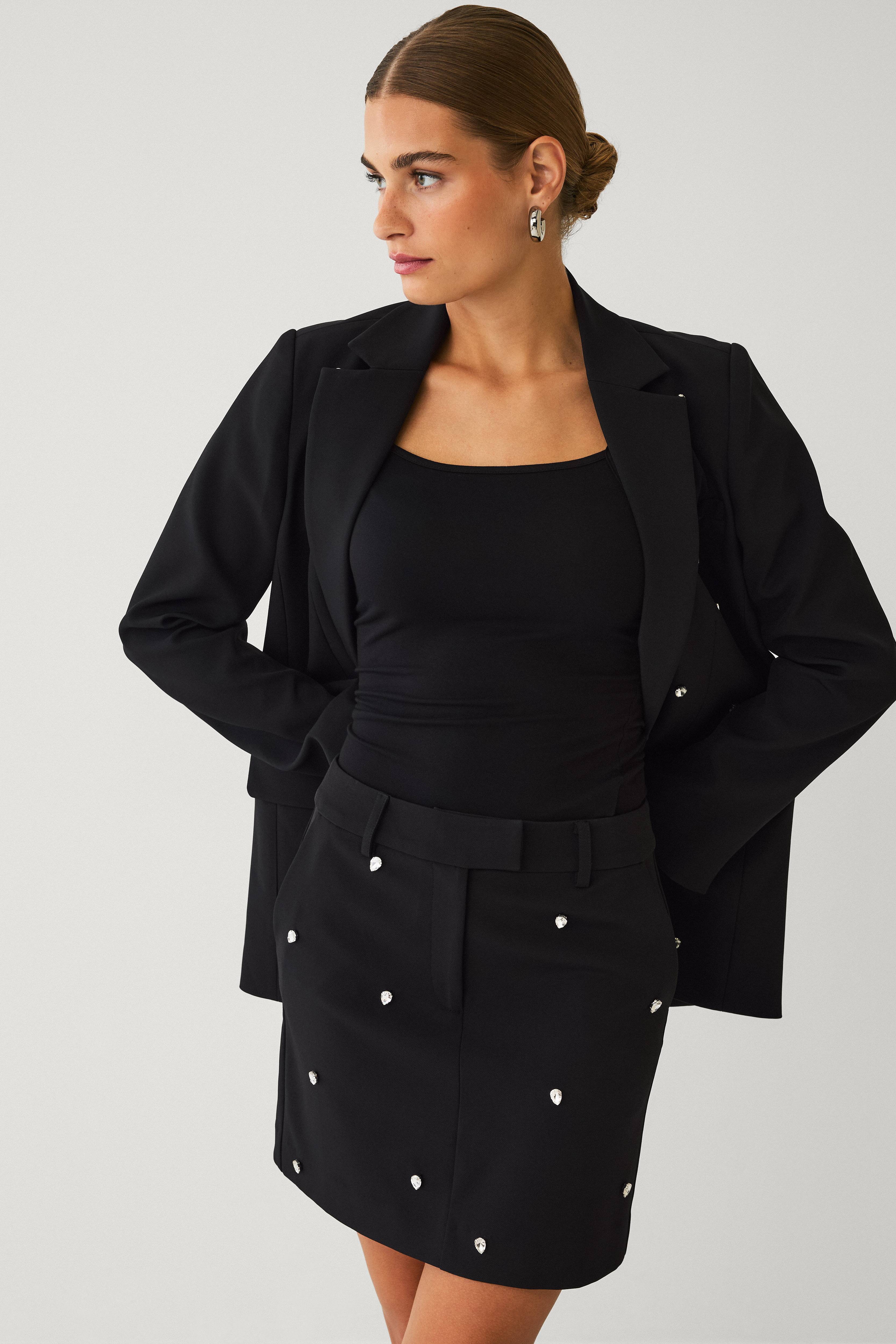 • Normalhøj talje• Bælteløkker• Gylp med lynlås• Bøjle og krog• Sidelommer• Dekorative rhinstene hele vejen rundt• Normal pasform• Længde: 44 cm i størrelse S