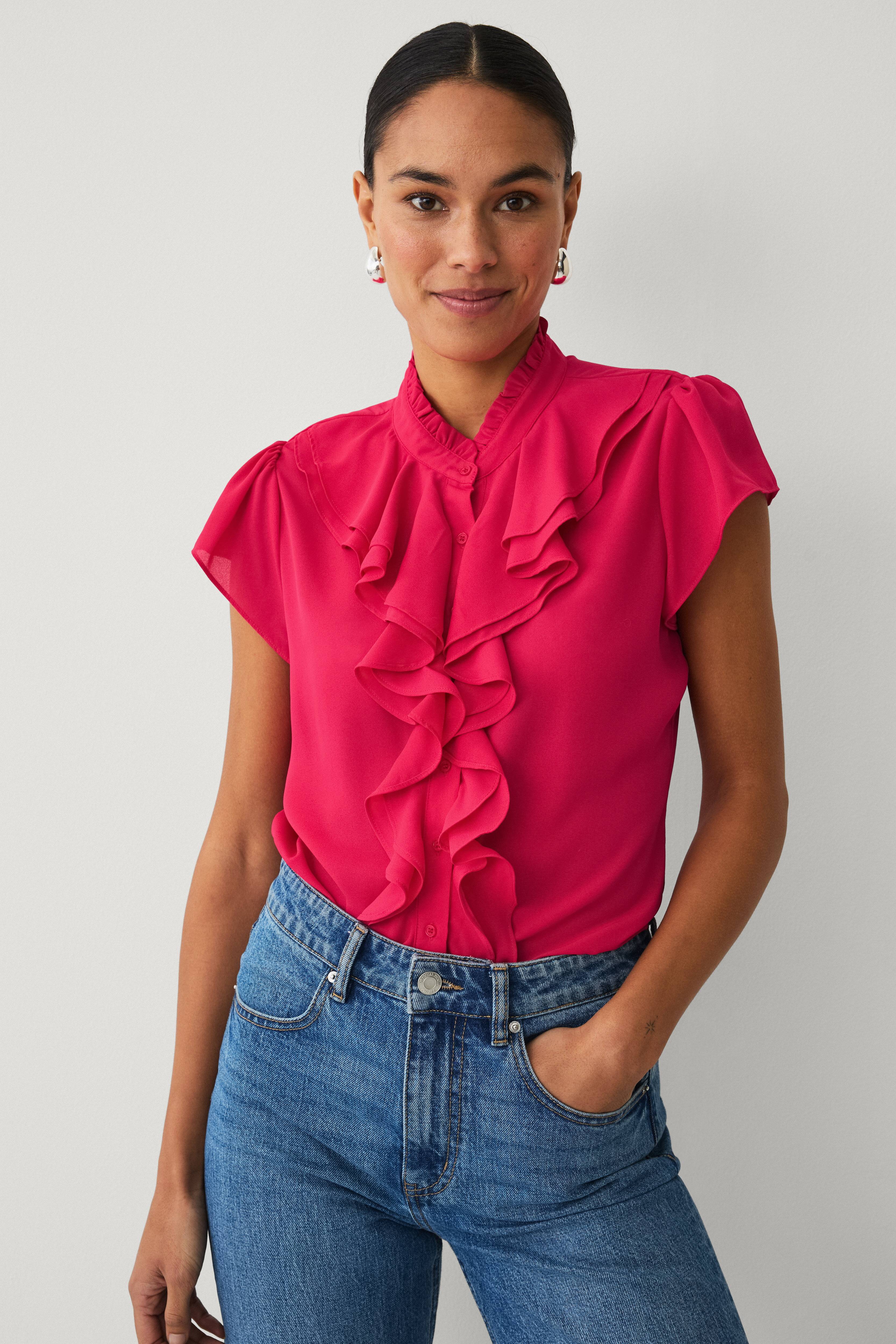 • Tynd bluse med korte flagrende ærmer• Rund halsudskæring med smal flæsekant• Volant rundt om halsen og langs knappen foran• Knapstolpe foran• Længde: 67 cm i størrelse S