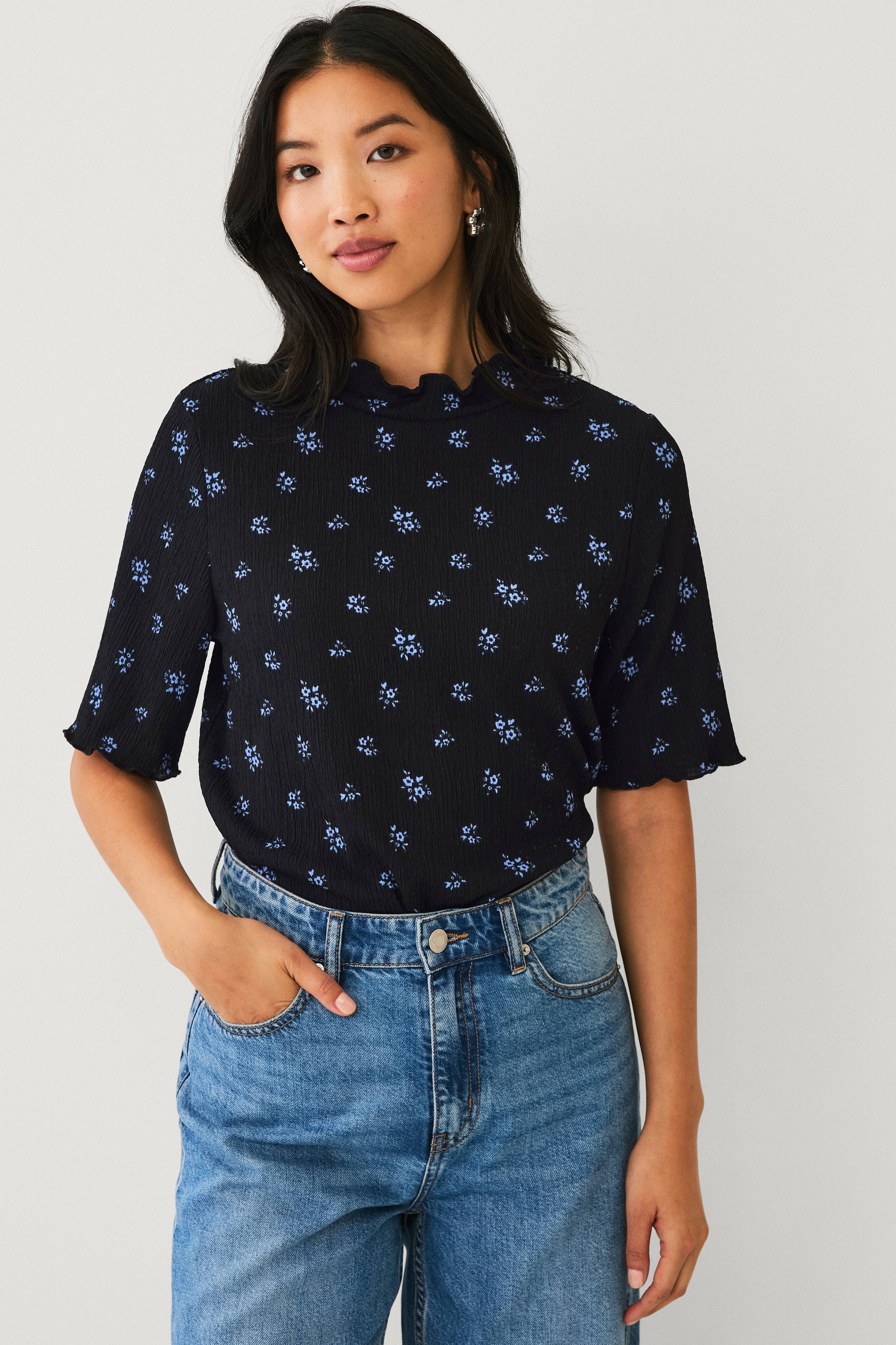• Elastisk stof med struktur• Blomstermønster overalt• Rund, halvhøj halsudskæring med flæsekant• Korte ærmer• Flæsekant ved ærmeafslutningerne og ved nederste kant