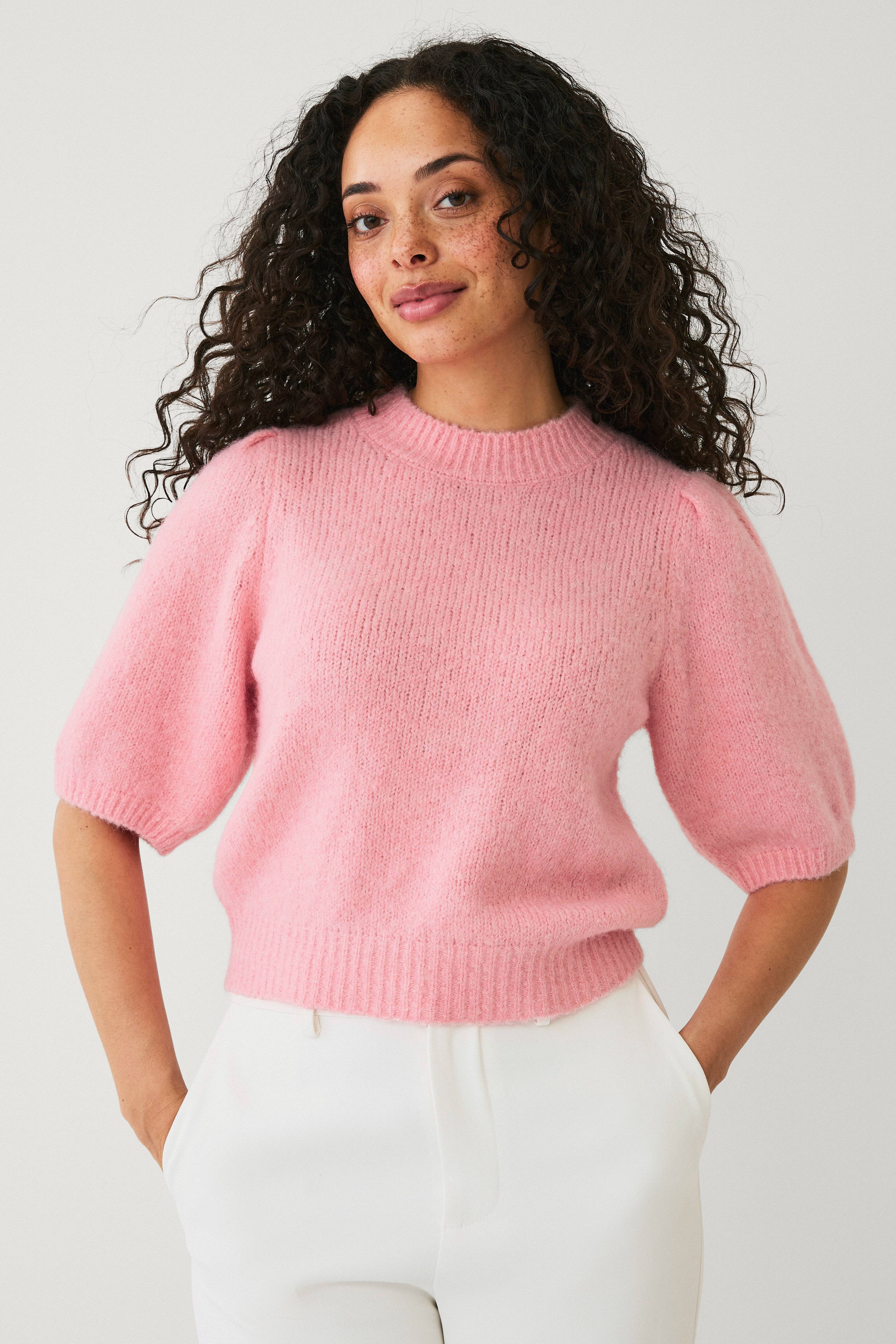 • Lige, glatstrikket model • Rund hals med ribstrikket kant • Halvlangt ballonærme • Ribstrik nederst og ved manchetterne • Længde: 53 cm i størrelse S