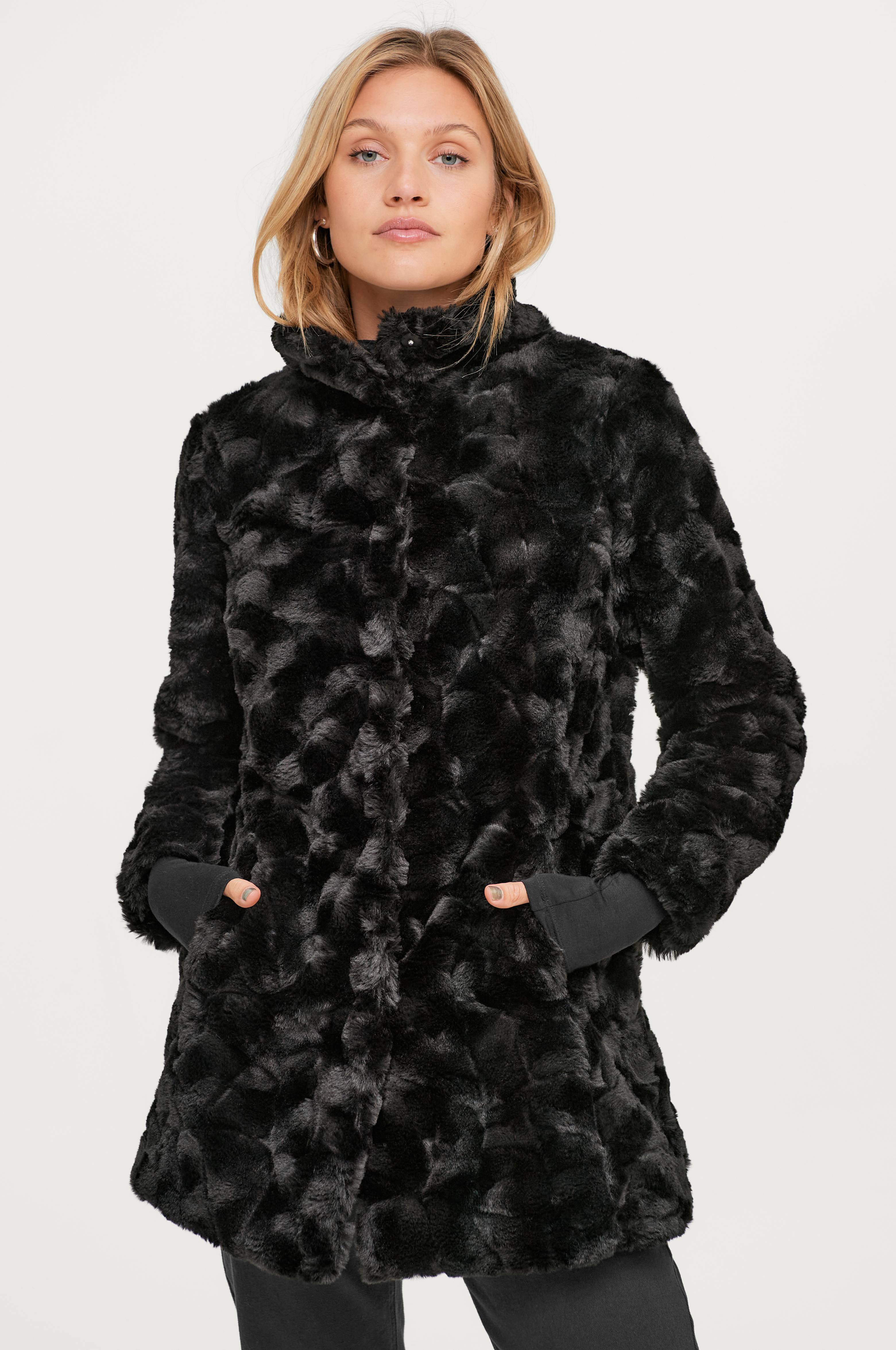 Kunstpels Sofia med skjulte trykknapper og lommer foran. I blød kunstpels med strukturmønster. Foret. Længde ca. 82 cm i str. 36.