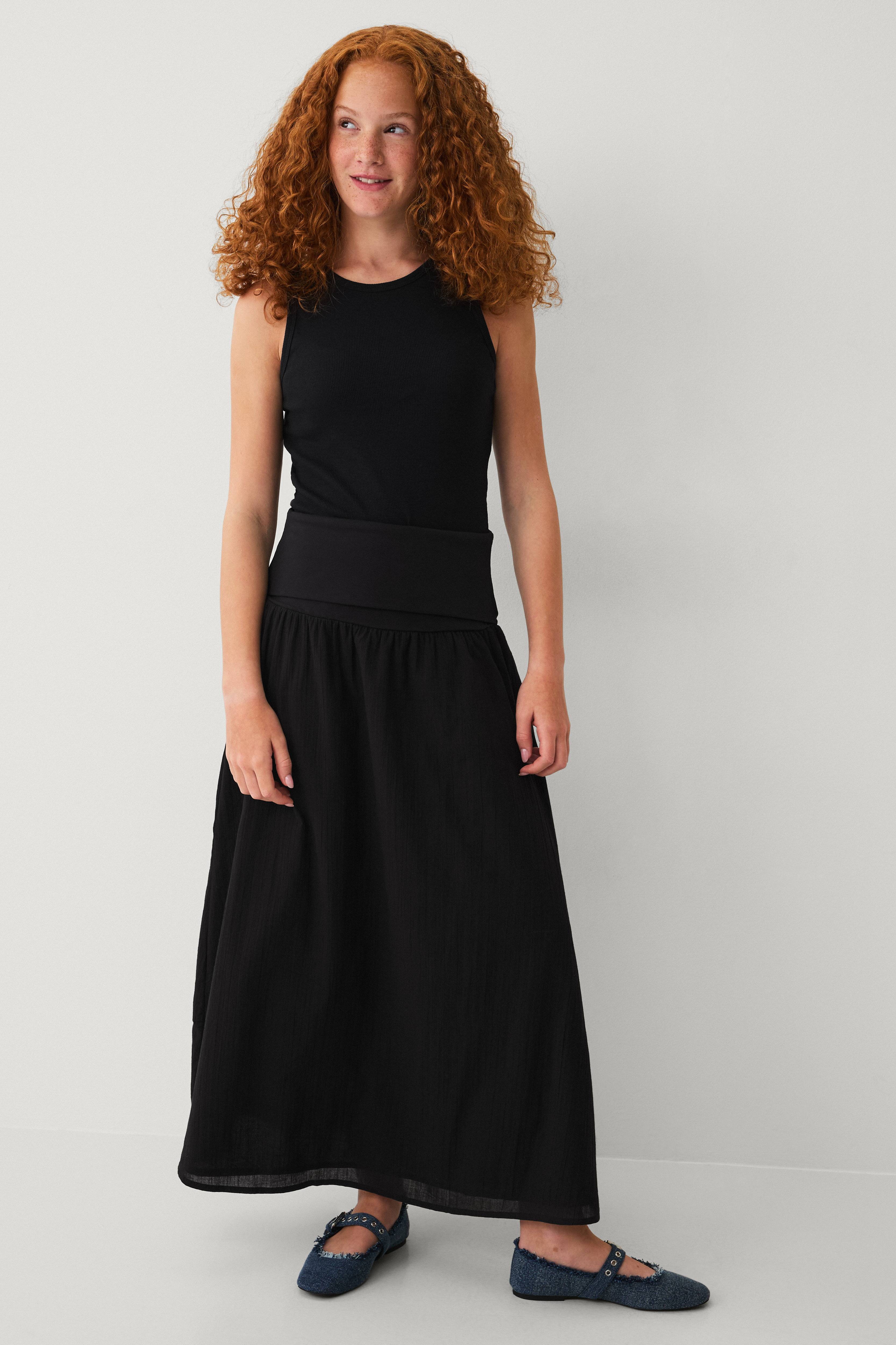 • Foret nederdel med svaj i vævet materiale• Foldbar talje i elastisk jersey
