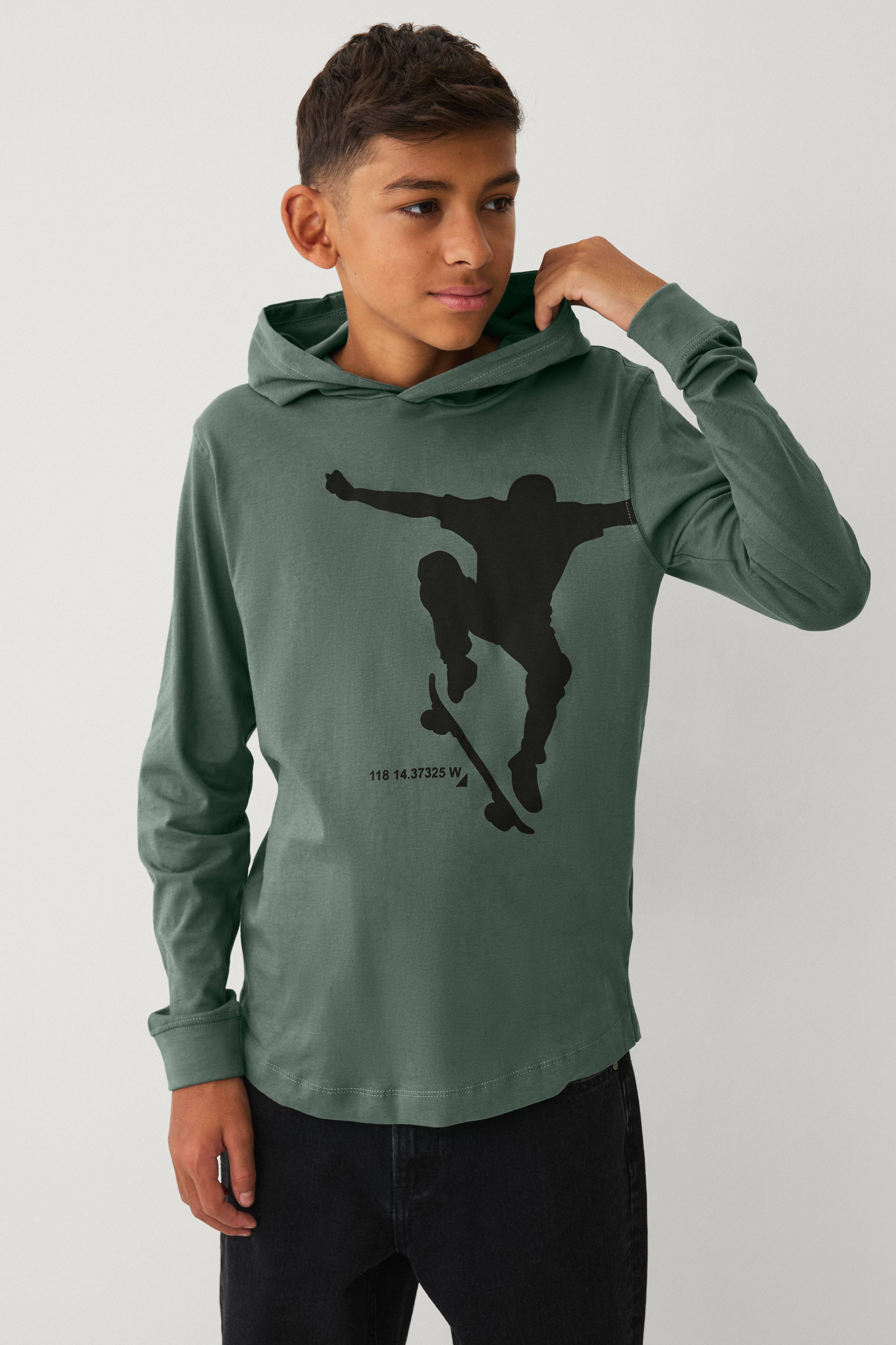• Langærmet t-shirt i bomuldsjersey med hætte• Tryk foran• Ribmanchetter ved manchetterne