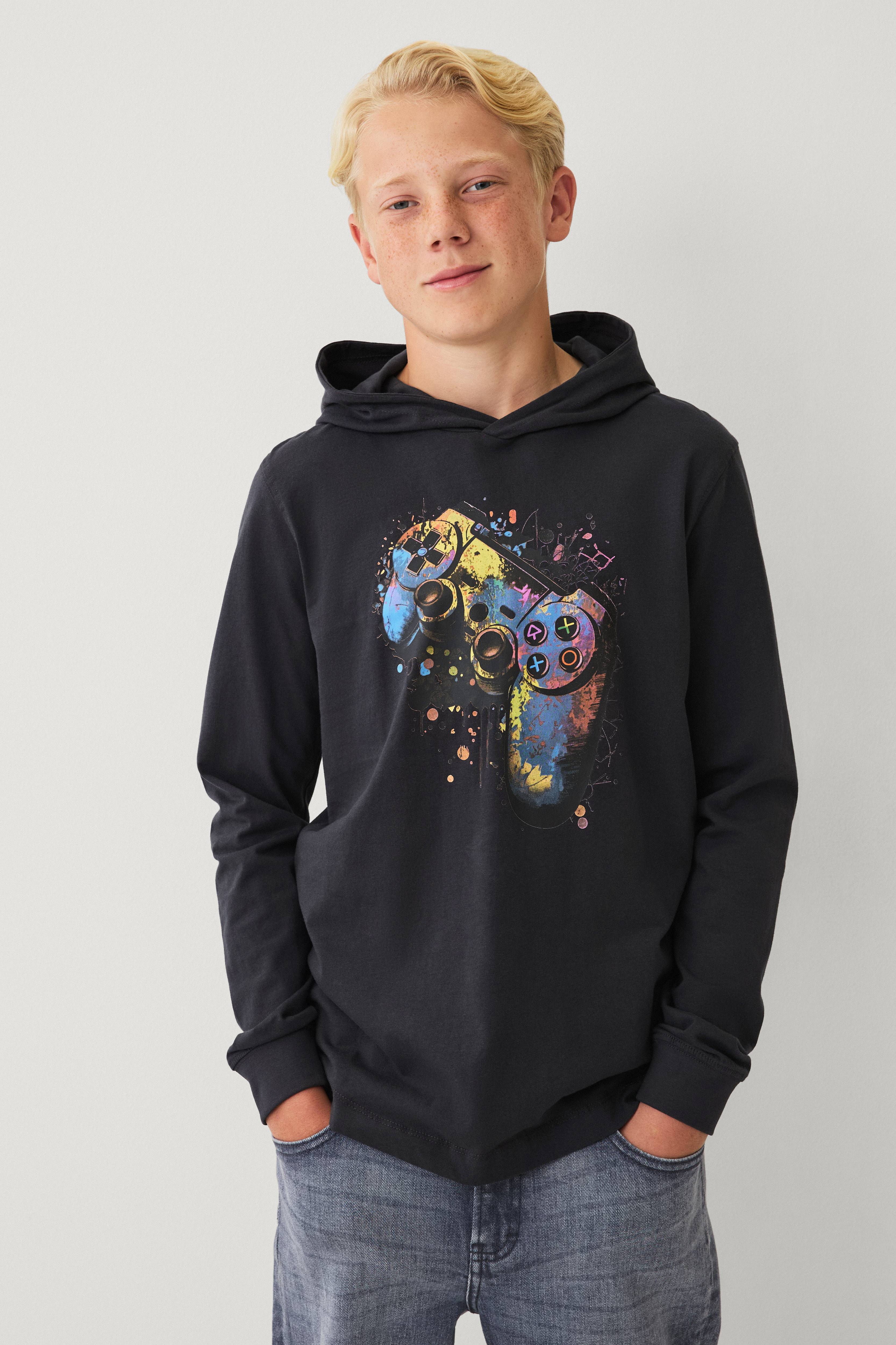 • Langærmet t-shirt i bomuldsjersey med hætte• Tryk foran• Ribmanchetter ved manchetterne