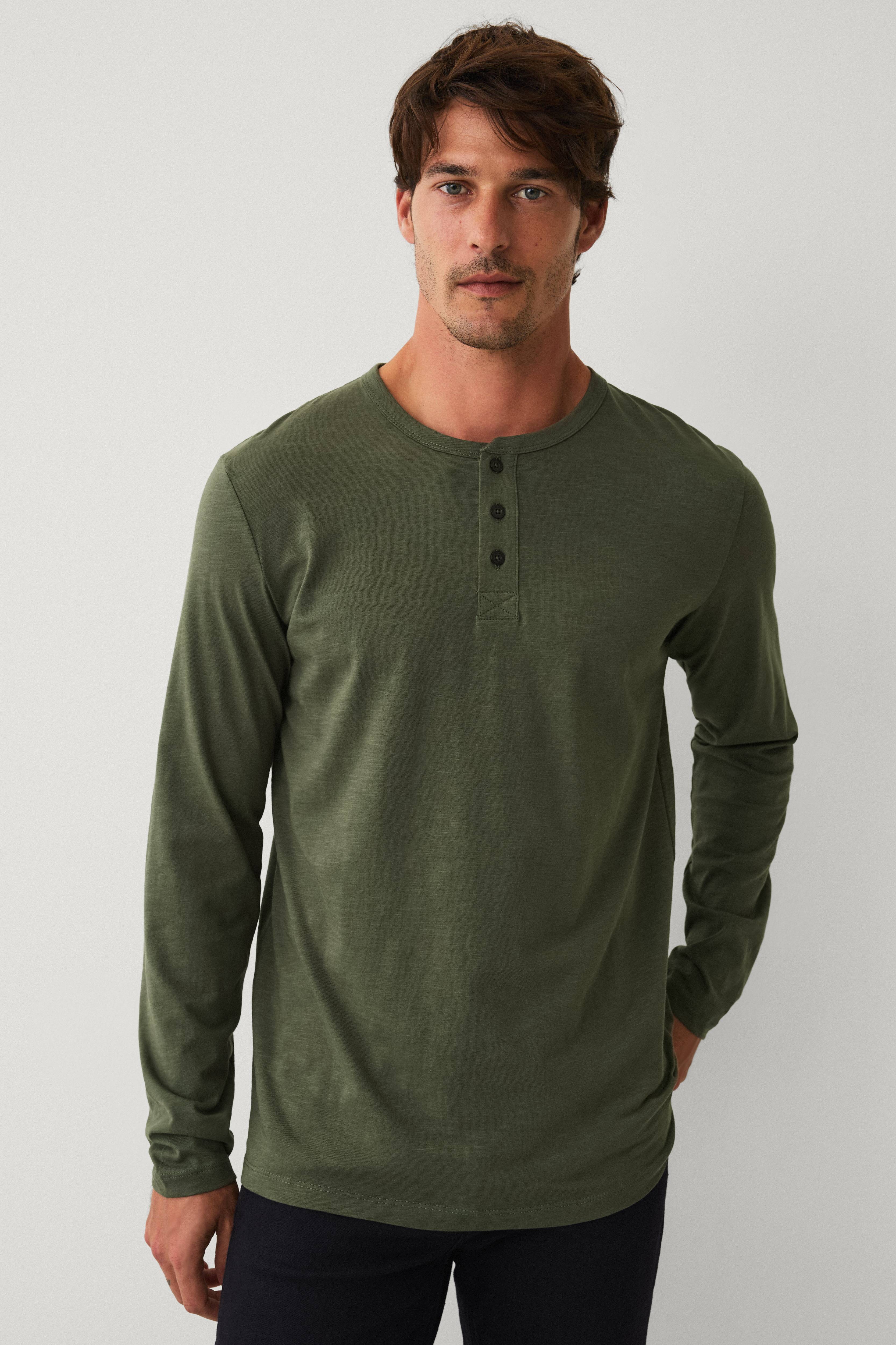 • Meleret model med kort knaplukning foran• Rund halsudskæring• Lange ærmer• Normal pasform