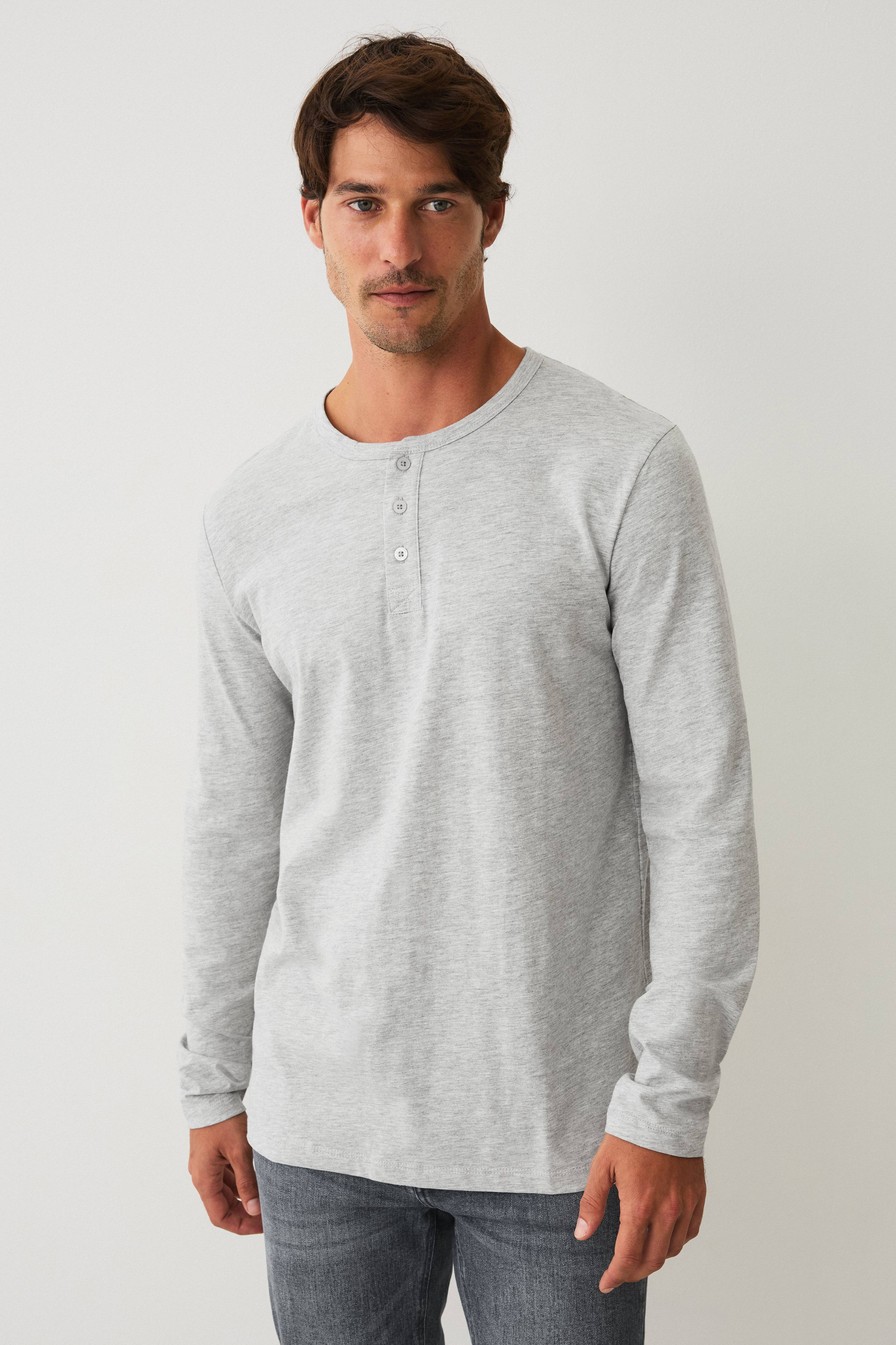• Meleret model med kort knaplukning foran• Rund halsudskæring• Lange ærmer• Normal pasform