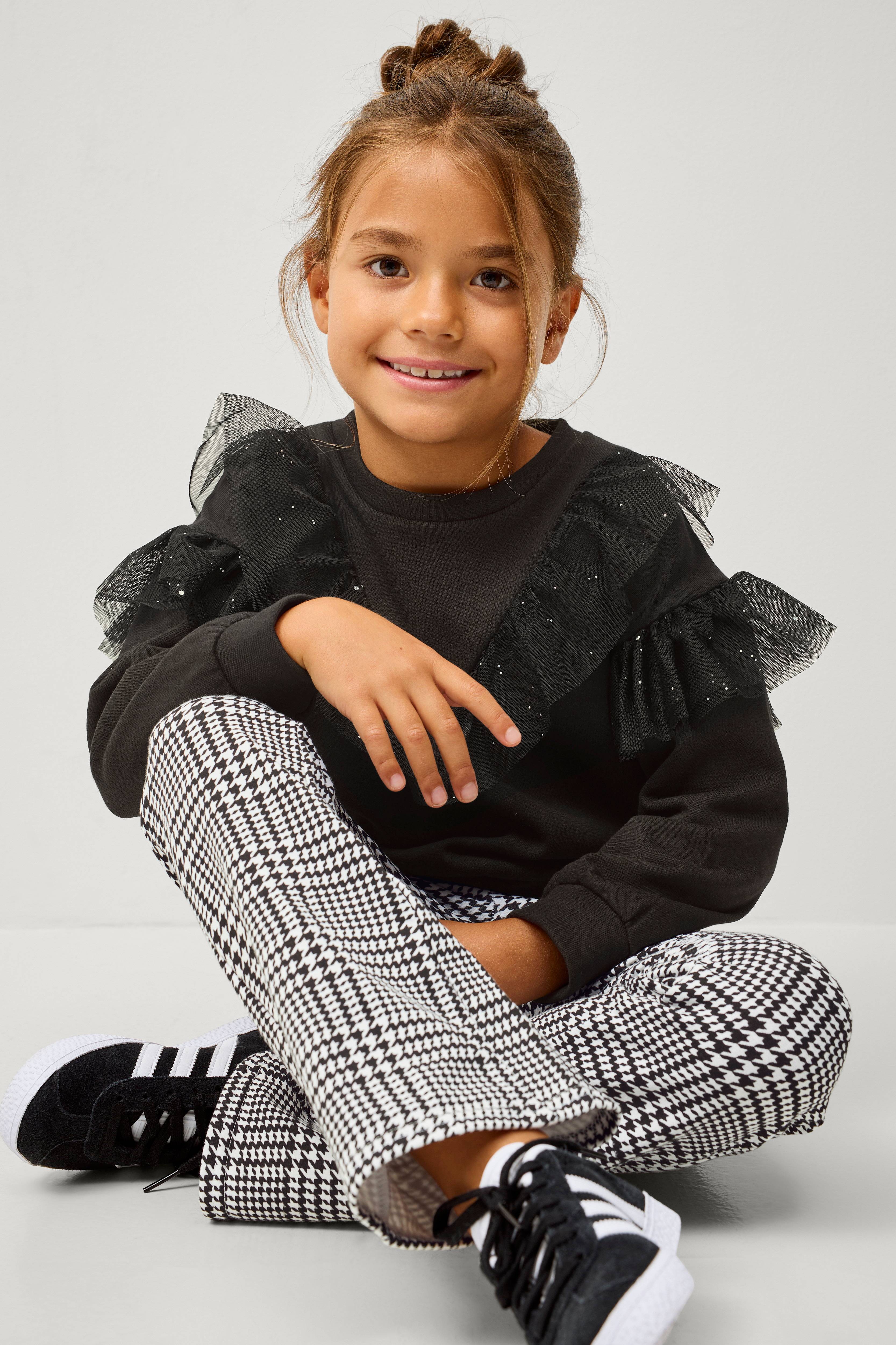 Modellen er 121 cm høj og bærer en str. 110/116